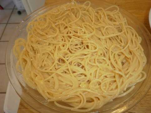 Boil 8 – 10 oz. of spaghetti noodles, then drain and add 2-3 Tbl butter, 1/3 C Parmesan cheese and 2 eggs, well beaten. Place 1/2 of spaghetti mixture evenly in 2 greased pie pans.
