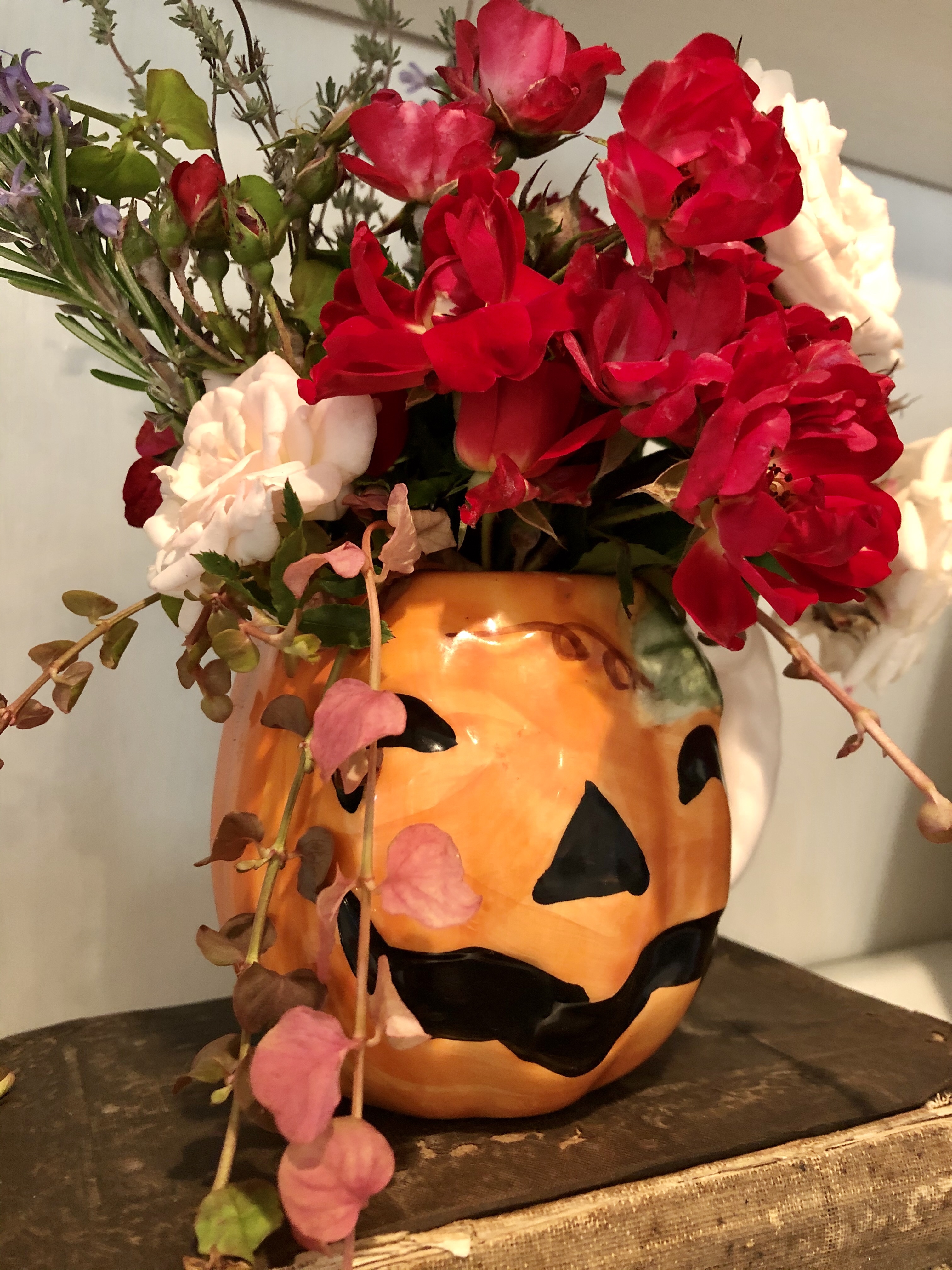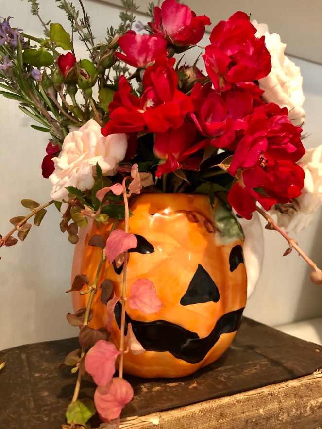 Here’s another arrangement I made with the last of my roses. I took my Halloween mug and filled it with the roses, some thyme and Creeping Jenny. It looked adorable on my book shelf.