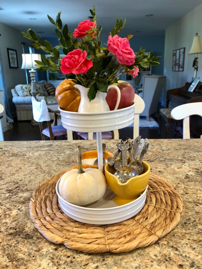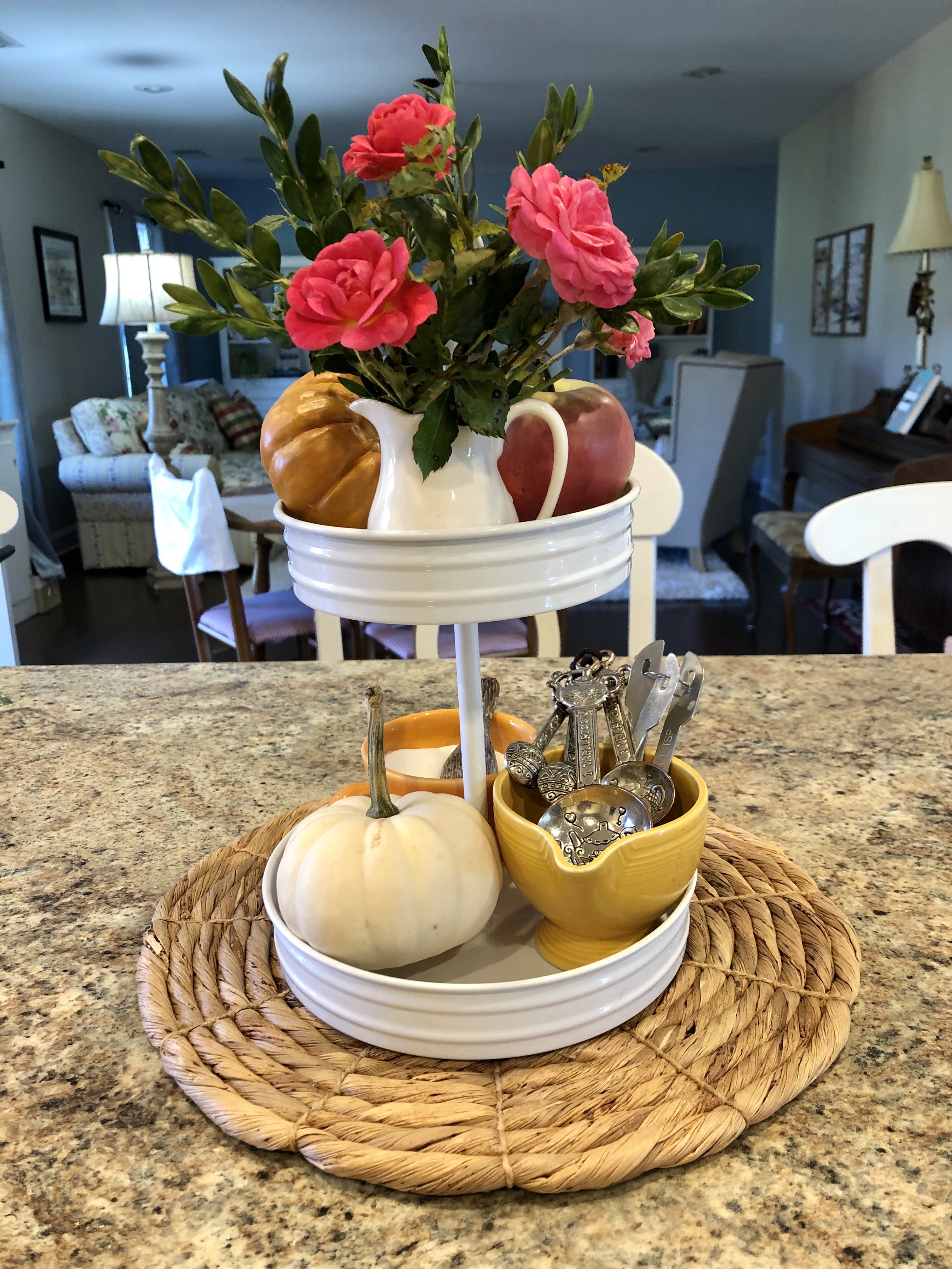 Lastly, here’s a small pitcher that fits into my tiered stand on the island. I love the pop of color it gives. The green bush addition really fills it out, don’t you think?