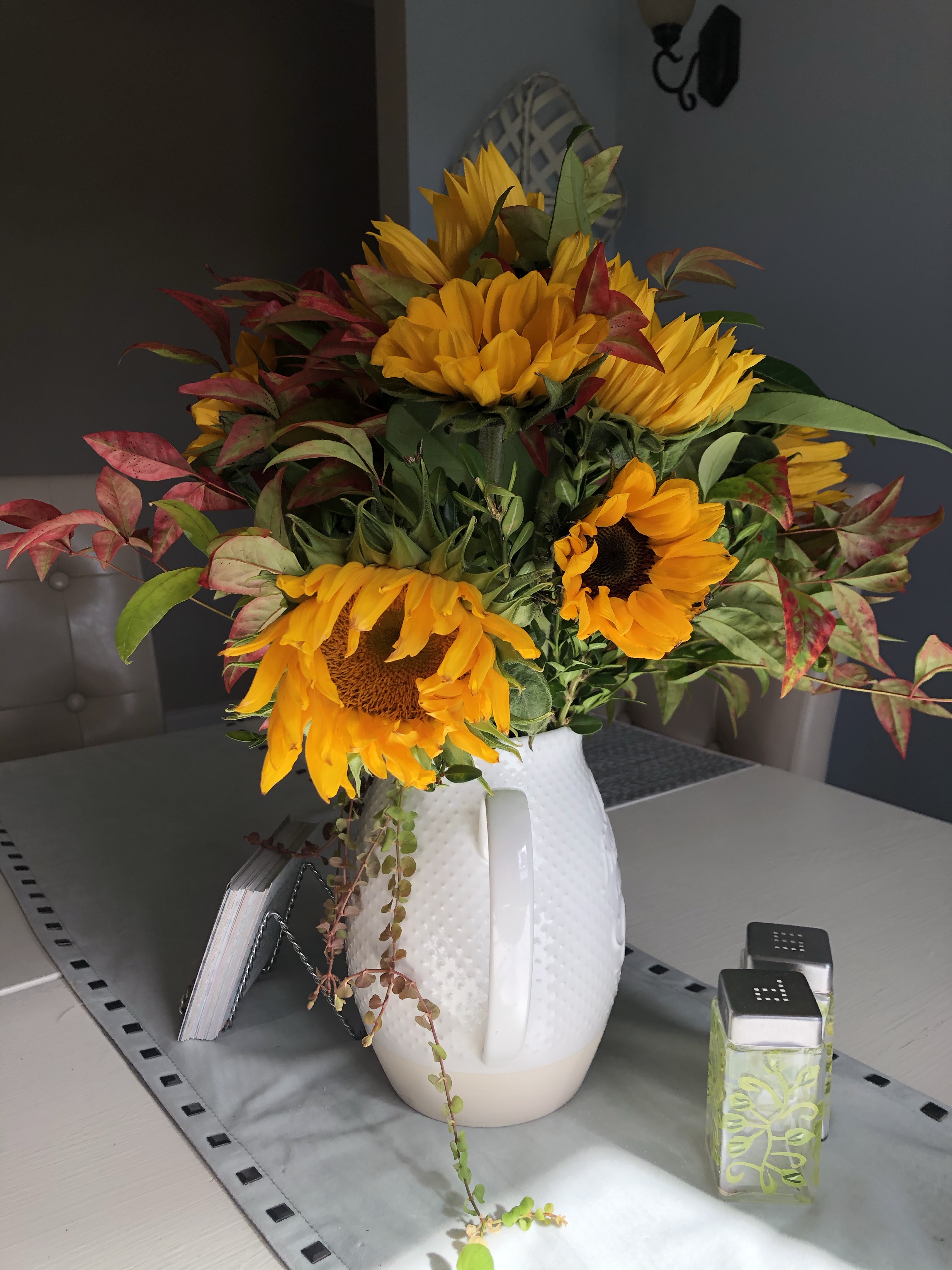 Okay, I’ve always cut my roses or hydrangeas, but to cut bush branches and fill a vase instead of using plastic greenery, was just never a thought. Look what my fresh bushes did to a $4 purchase of sunflowers from my sweet husband!