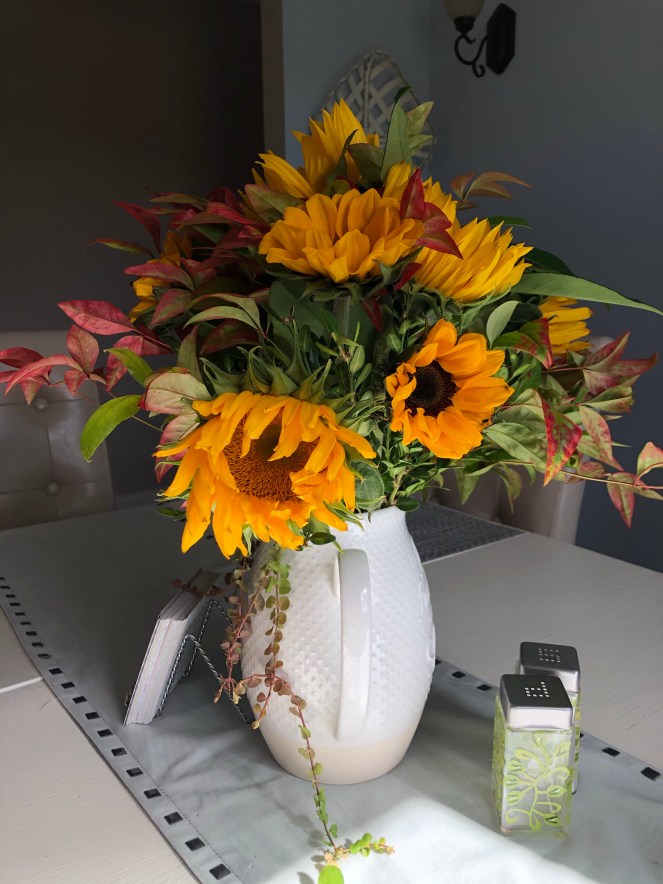 Everything except the sunflowers came from my yard. Those flowers are pretty, but all that greenery bumped them up to a florist grade arrangement. Thank you, Lord, for a yard full of beautiful plants that I can snip!