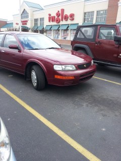 Yesterday I went to our local Ingles to do my grocery shopping.  When I had finished and returned to my car, I looked up and saw the car pictured here.  That car is not in motion!  It’s parked like that!  I laughed out loud, then I had to snap a picture.  It was too unbelievable not to share.