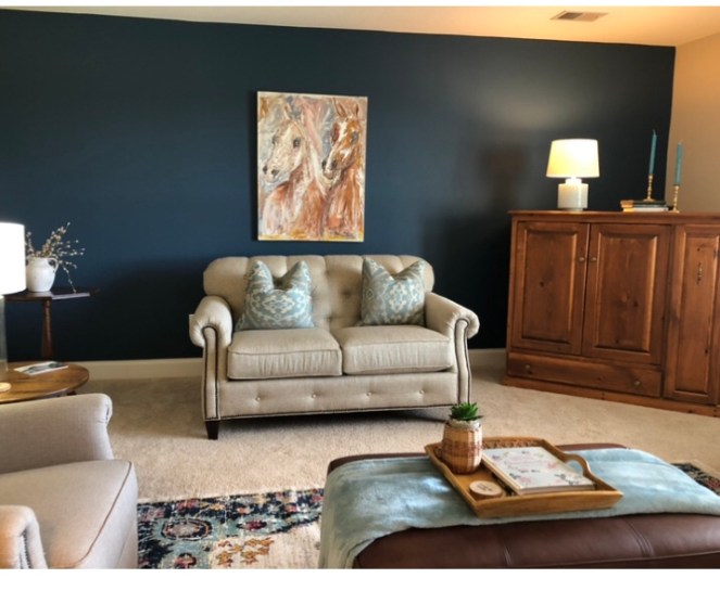 When I decided to redo the room, I used a beautiful horse painting we were given by the dear man who painted it to guide my colors and style! It’s quite large and I could never find a spot to hang it. Now it’s the centerpiece of the room. I painted the wall behind it a deep blue to accent the colors in the painting and make it “pop.”