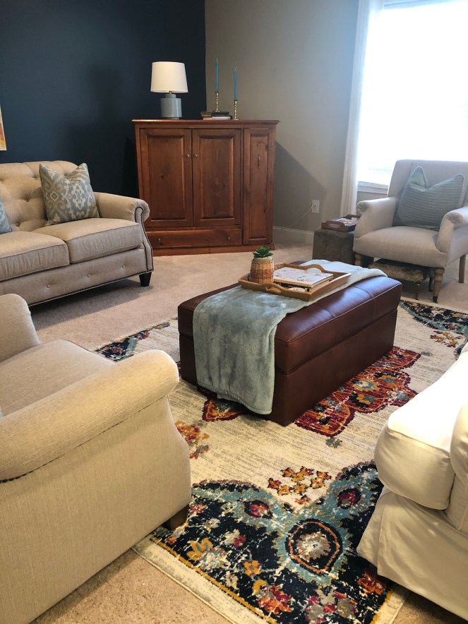 Again, following the advice in The Cozy Minimalist, I purchased my rug before choosing paint. These had all the perfect colors from the horse painting and is large enough to go under the sofa and chairs.