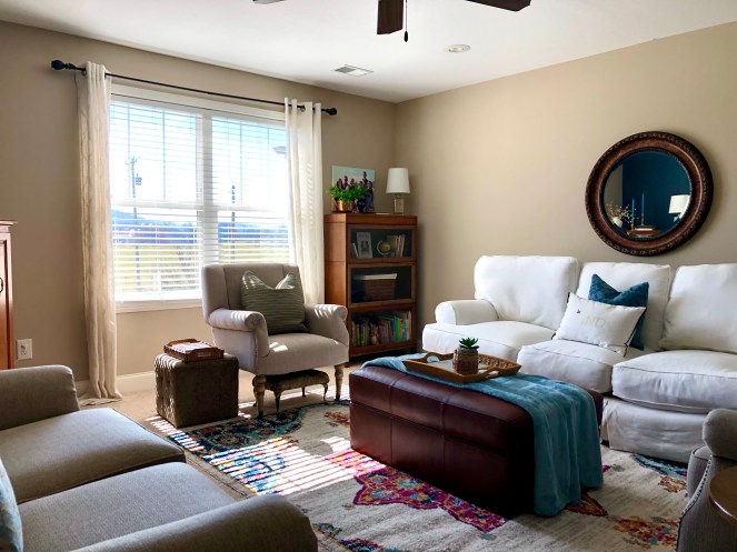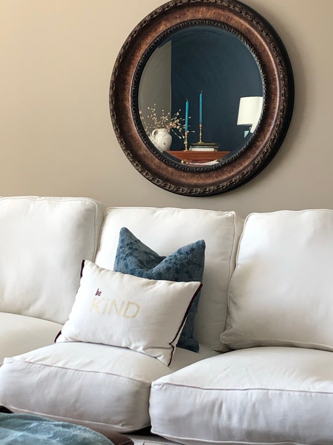 We did some furniture swapping in our house and had two chairs that worked perfectly for more seating. Shopping your own house is great and free!! The only other thing I purchased is the large round mirror over the sofa. It came from Hobby Lobby and was purchased at 50% off! I love that it reflects the painting, the blue wall and the good light from the wide window.