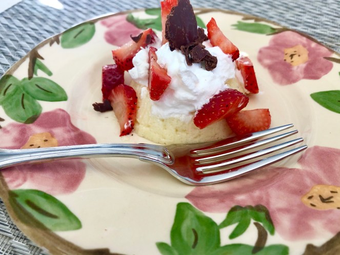 They’re truly the perfect size if you’re wanting to watch your calories, but still enjoy something sweet. I bake them without any crust, then give my guests the option of sprinkling chocolate covered graham crackers on the top. It serves as an inverted crust! Then I top them with fruit, light Cool Whip and chocolate shavings. Wow. They are so good! Here’s the recipe: