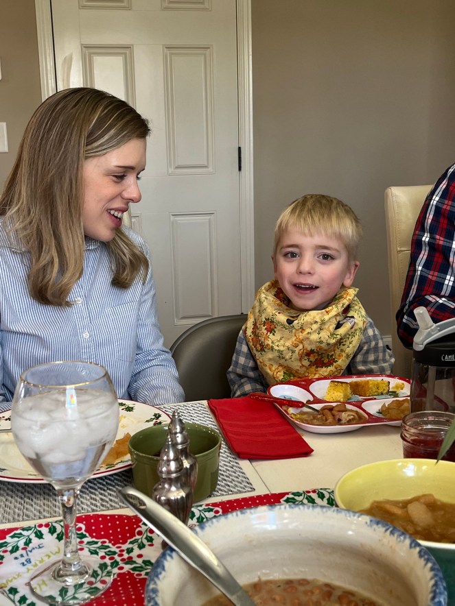 After church yesterday we were blessed to host everyone for Sunday dinner. It was very impromptu, but I made a simple meal everyone loves – Soup beans and cornbread. I used the simple recipe I’ve shared here. This is such a great meal for ease and for comfort. I served it with roasted potatoes, cornbread, and cooked apples. Even our little guys love this meal.