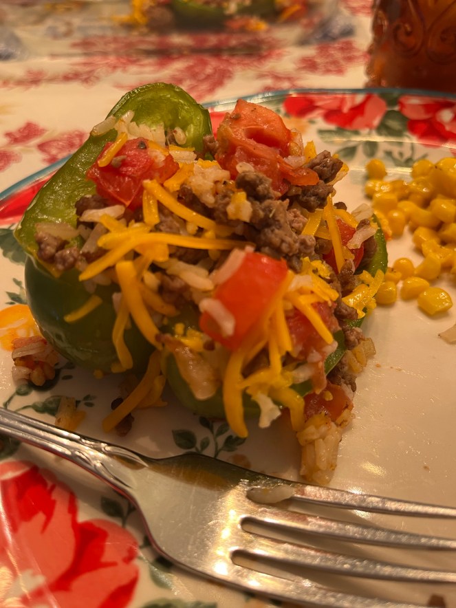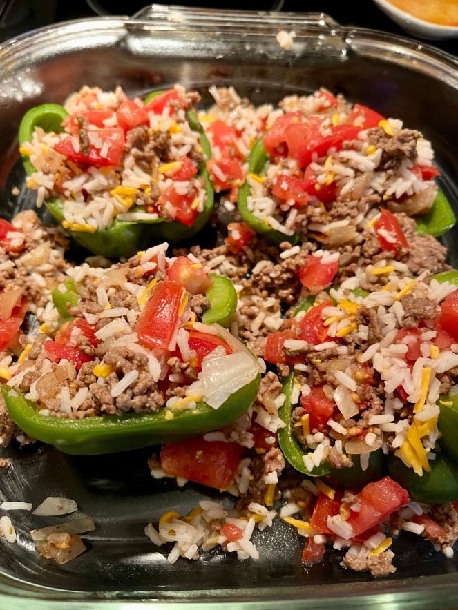But in recent years I found a recipe that uses fresh tomatoes, rather than tomato sauce, and the instructions to only boil the peppers for a few minutes helps the peppers to have a slight crispiness to them. There’s plenty of the rice and beef filling, so you can pile them high and add extra meat around the peppers. They also have an addition of cheddar cheese, giving a final recipe-booster! These slight changes in this old-time recipe make this an absolutely delicious supper meal!