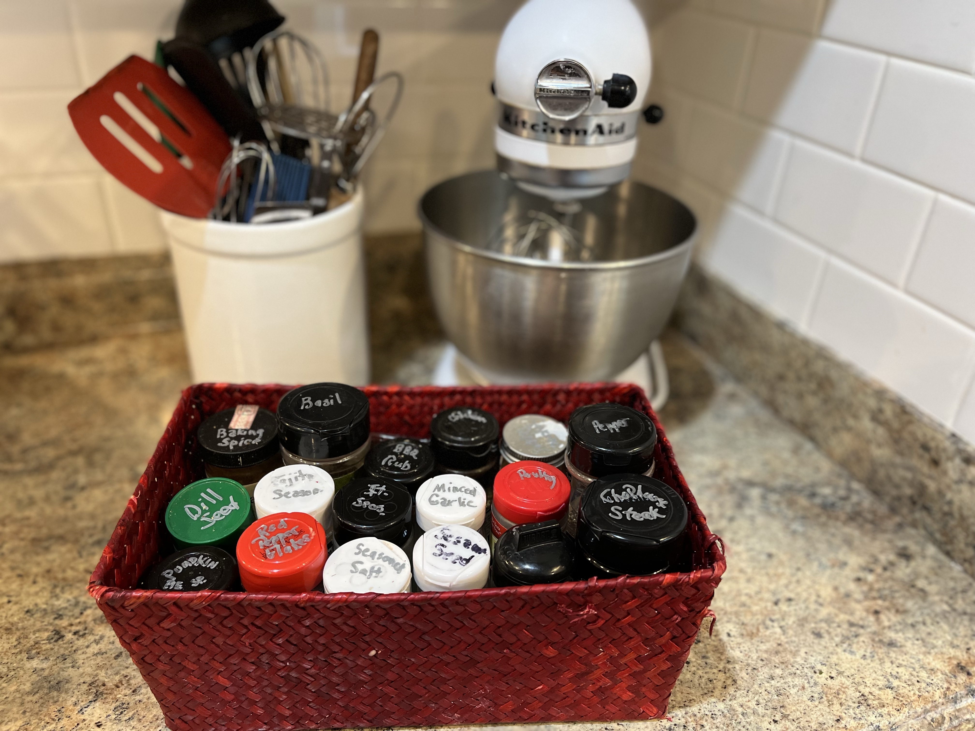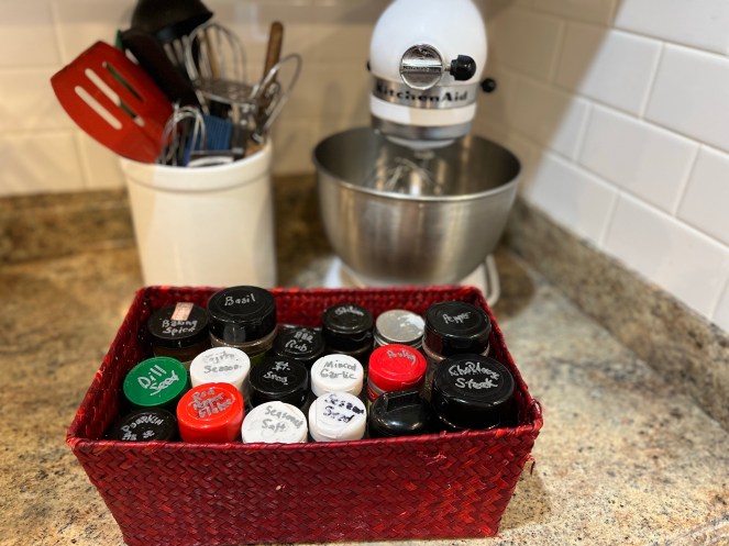All my other spices and herbs are stored in the cabinet above. The jars are in a basket. I write the name of the spice with a Sharpie so I can see what it is without having to lift it out of the basket. These are also alphabetized.