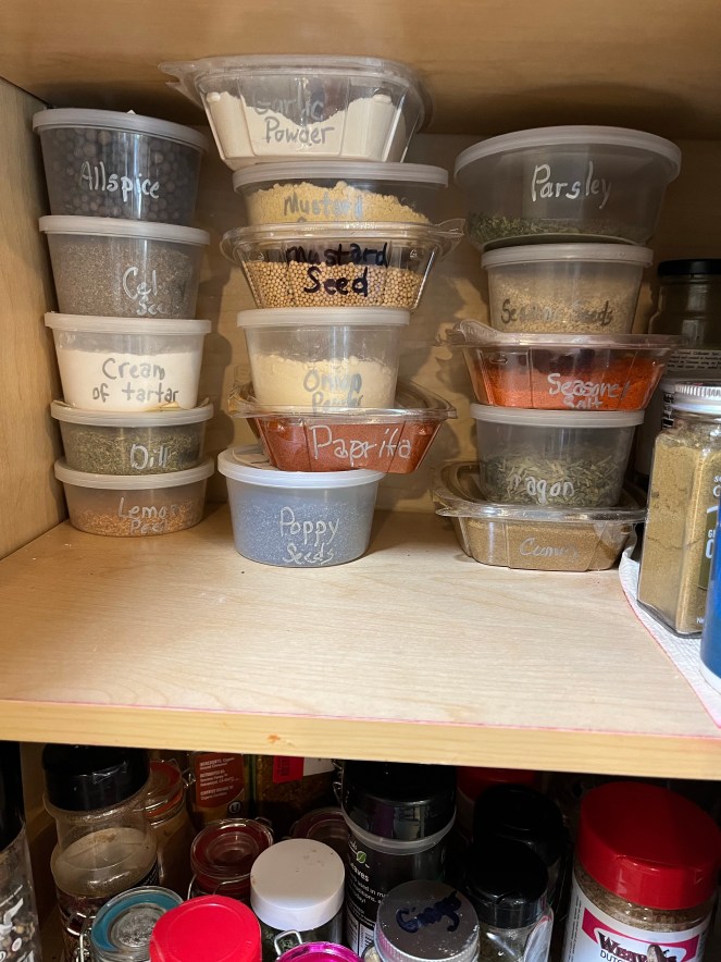 I use the lazy susan/ turn tables too. Also have one of those “ as sold on tv” kind of organizer that has pull out little drawers . I have had it for many years. What kind of plastic containers are the Amish spices in? Thanks for sharing! Hope y’all are ok