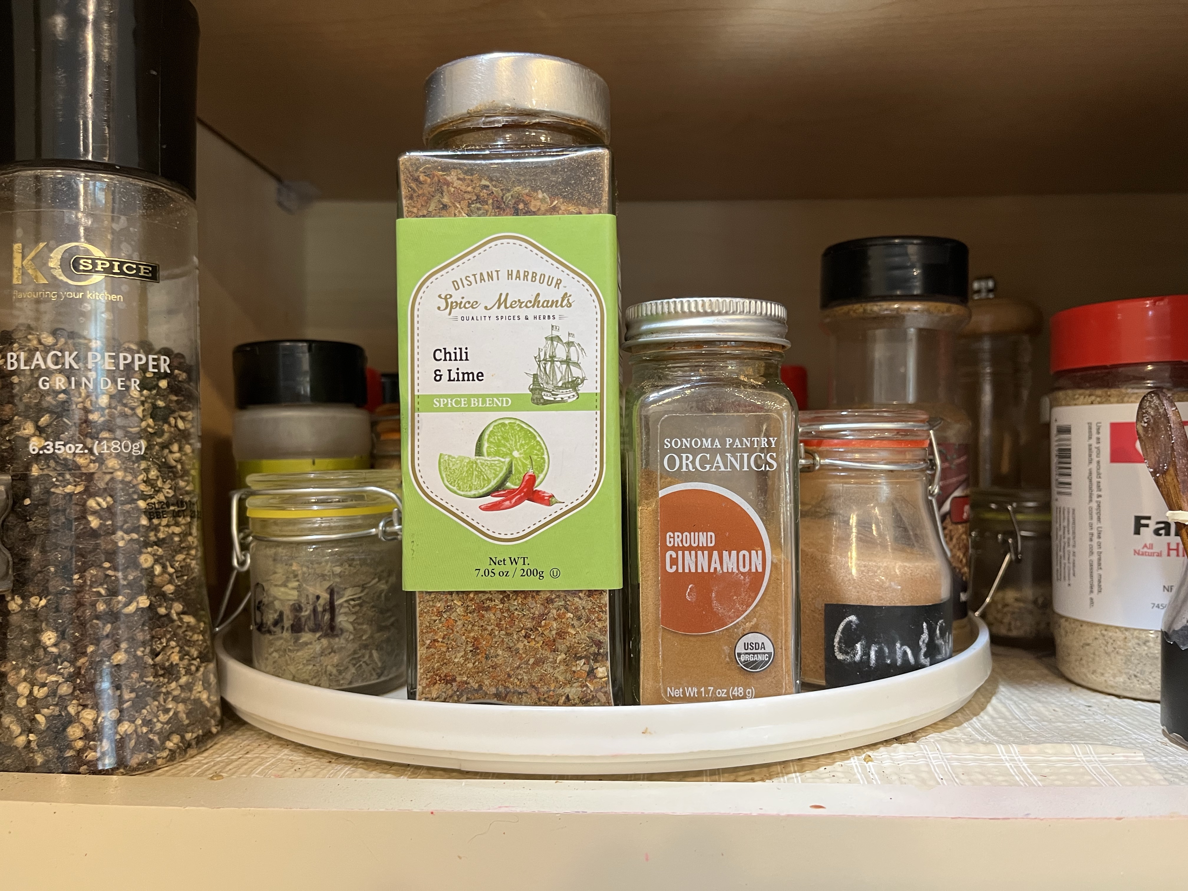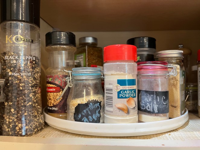 I don’t have a spice drawer, so I use small lazy Susan for the most frequently used spices. I try to put them alphabetically in order so I don’t have to go digging through them all to find the one needed in a flash. I start on the outside circle and work my way to the middle.