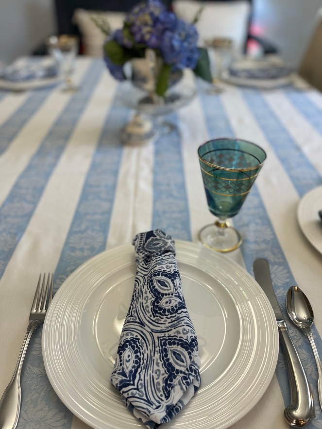 For the tablescape, I chose a blue and white color scheme. I was so happy that my Hydrangeas were beginning to bloom so I had fresh flowers at my fingertips. I did a new napkin fold that looked like a tie. You can check that easy instructions out on my Instagram, if you’re interested.