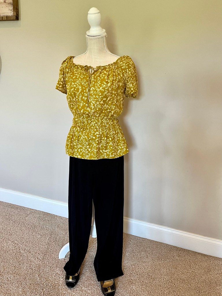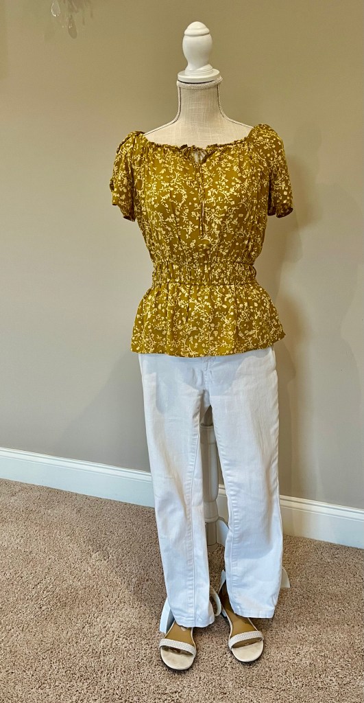 The peplum top in the picture above is full and loose below the waist, and also the sleeves, so styling it with a pair of straight legged white jeans keeps it looking balanced. However, if i styled this top with loose pants the result is quite different.