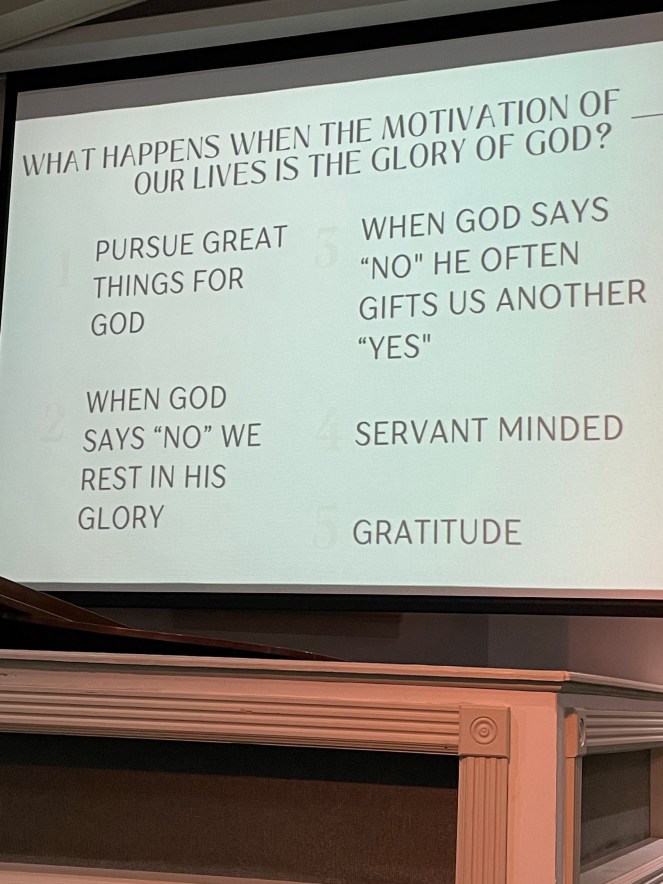 The challenge from God’s Word was about living our lives motivated to glorify God. Doing so will: