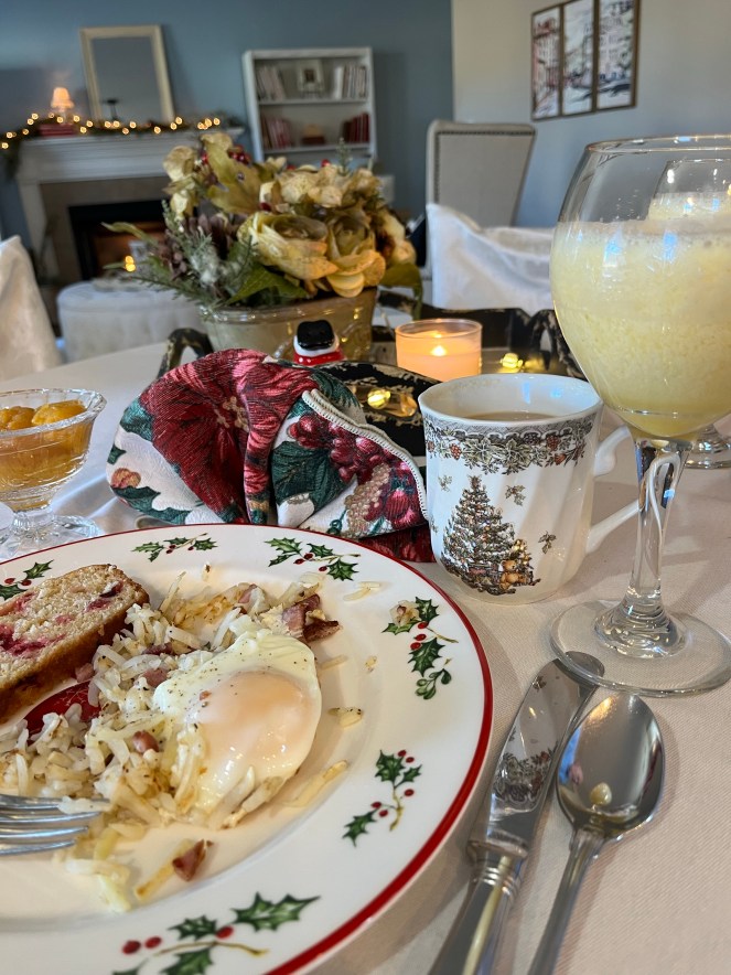 Christmas morning was quiet and unrushed. I fixed a late breakfast for Dale and me and we enjoyed it with a fire going on that very cold morning. Our traditional Orange Julius (recipe below) was served alongside eggs, hash browns, Cranberry Orange Bread, my canned peaches and cups of steaming coffee. It tasted heavenly!