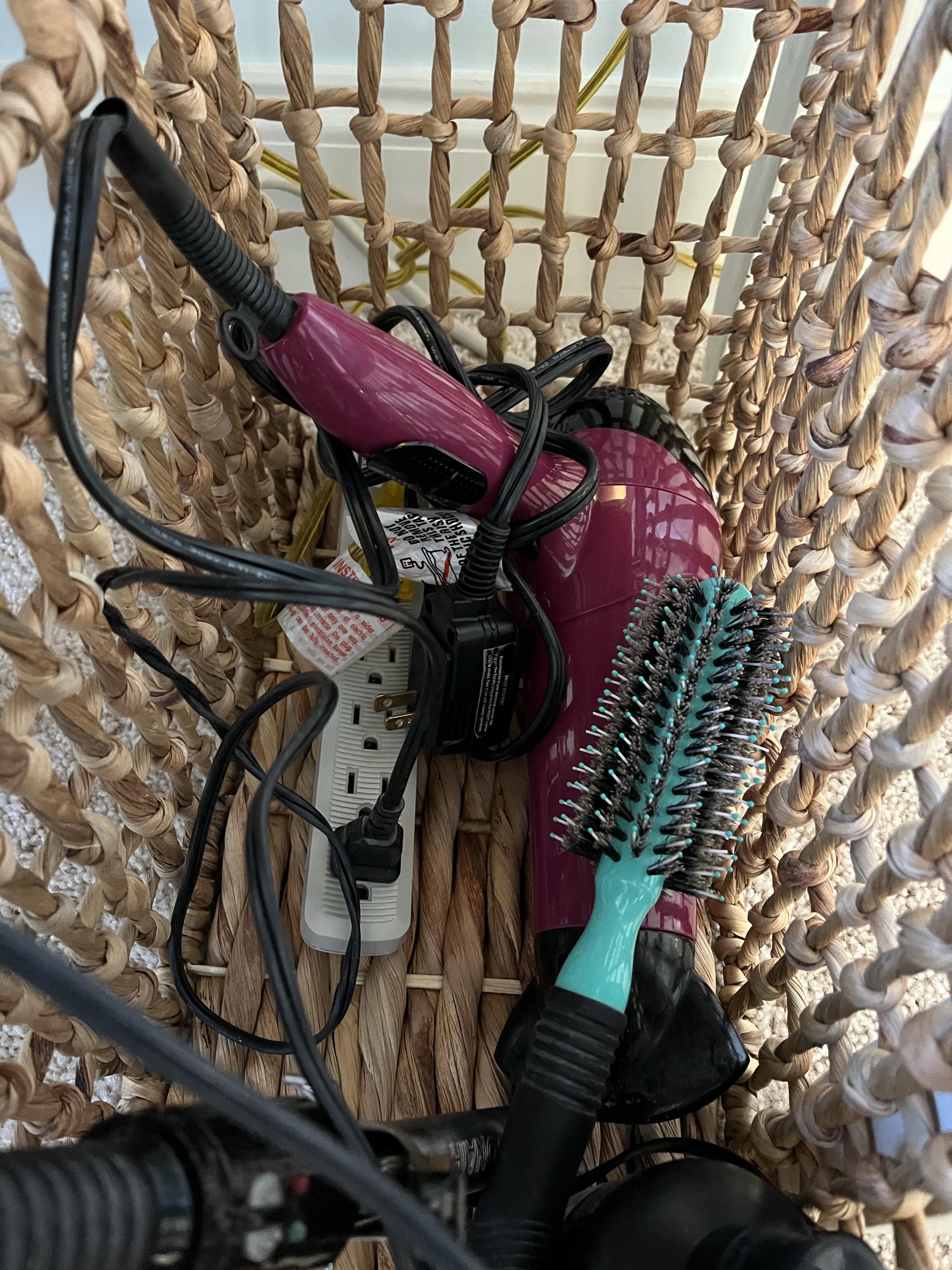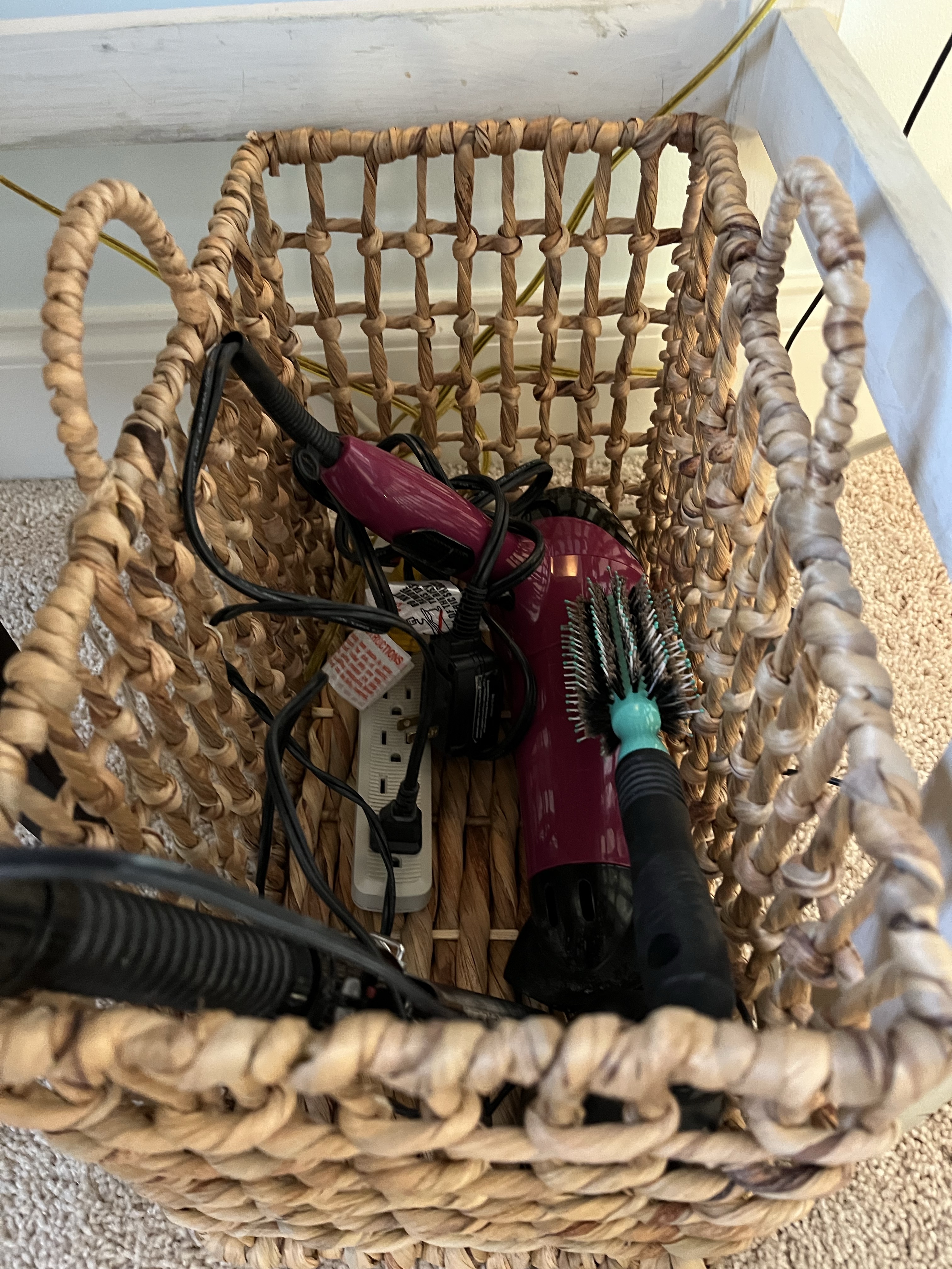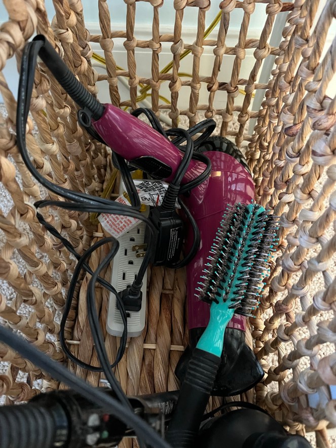 Then I was shopping at Home Goods recently and saw a large wicker basket with openings in the weaving and I knew it was the perfect solution to my mess! I brought it home and loaded all my tools inside, threading them through the openings. I even stuck the extension cord in there so I could keep the curling iron plugged in.