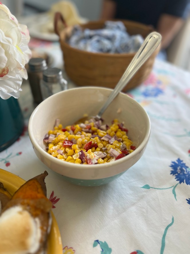 The other side dish I found was a Corn Salad with Goat Cheese. The warm corn slightly melts the cheese and makes it soooo creamy. We all loved this new dish! It has a small handful of ingredients and comes together so quickly.