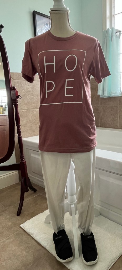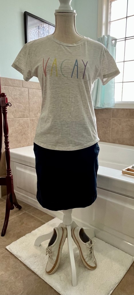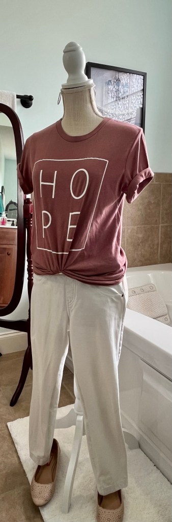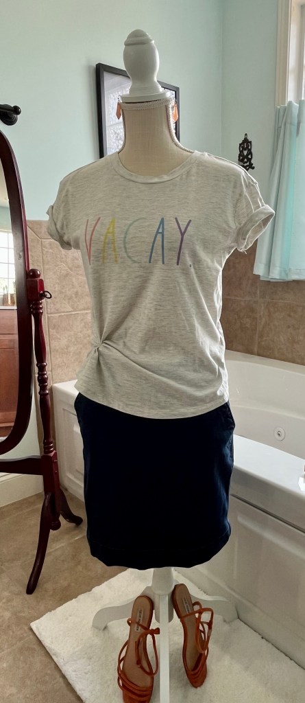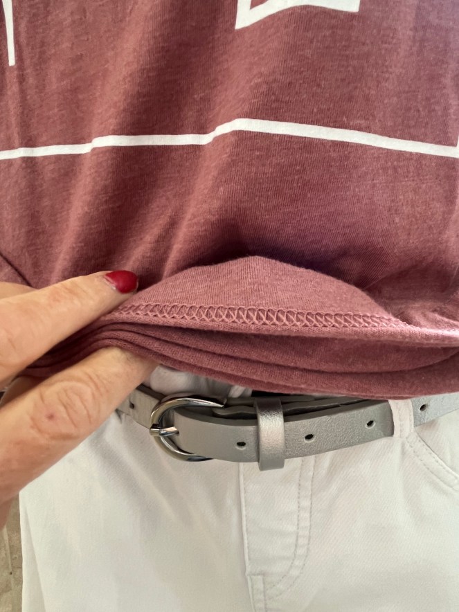 In the first picture the shirt just takes over. It’s long and unflattering. In the second picture, I have folded it underneath into a pleat and then secured it with a rubber band. Now it fits and also has some shape. I also folded up the sleeves. Adding a lighter shoe looks lighter and the sandal adds a pop of color.
