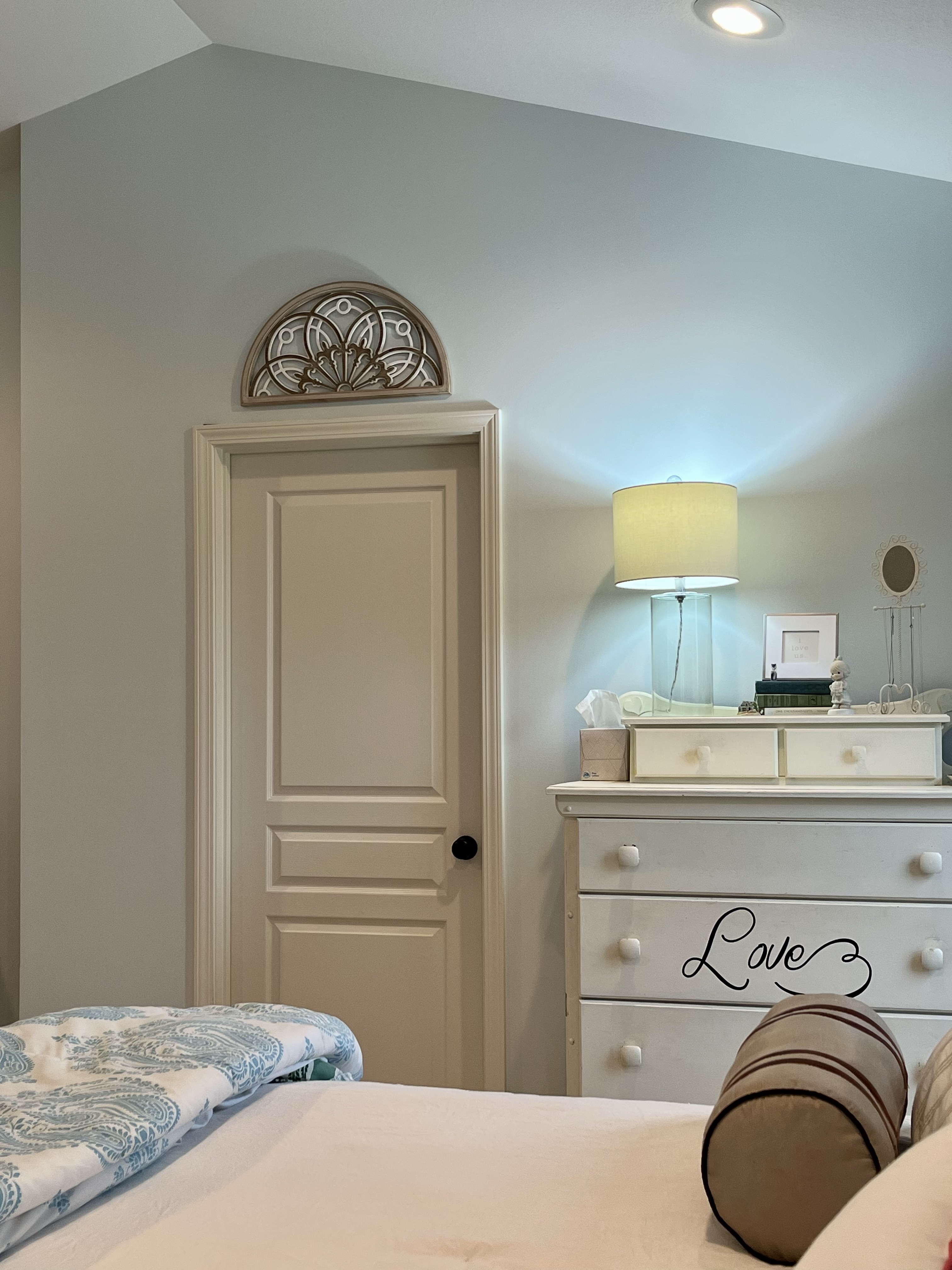 When I go into Hobby Lobby, I try to keep an eye on an item I’m interested in. I wait and wait until it’s marked down with an orange sticker or on the 75% off seasonal sale . The beautiful wood piece over my bathroom door (pictured above) had been $40 but I snagged it for $10. It found it on the aisle where all the other wood pieces were. So don’t limit yourself to the one or two aisles that say 75% off decor. Walk up and down, keeping an eye open for orange stickers! They are all throughout the store. It’s amazing to me how much a $10 decor piece can add to a room!