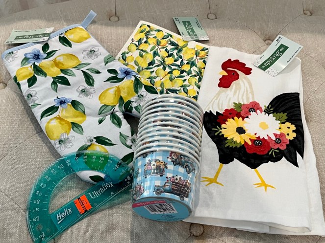 That square with the lemons on it is a set of two dish cloths. I love these. They turn soft and spongy in the soapy water. They last forever and can even be thrown into the washer. I use the paper cups for my yogurt breakfast when I’m headed out the door. They’re also good for scoops of ice cream when serving guests on the patio. They were sale priced at only $1.
