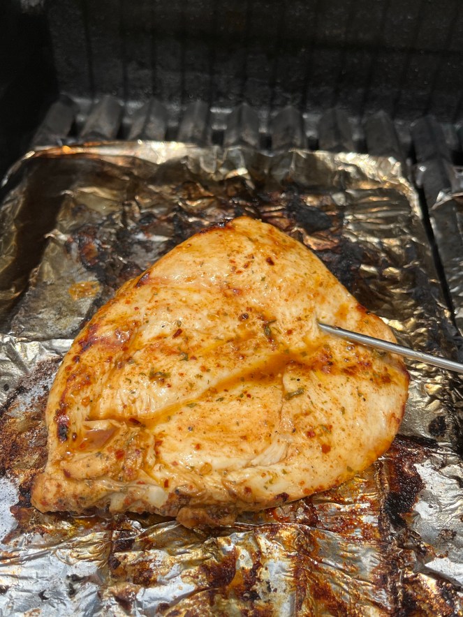 The next day I butterflied the chicken breasts (see this video if you’re not sure how to do that!) so they wouldn’t take as long to cook. I fired up the grill to about a medium heat. I mixed up another marinade of a couple tablespoons of olive oil, lime juice and Chili Lime seasoning. As I cooked the chicken, I kept brushing them with the marinade. I cooked them until they were right at 165 degrees. Then I placed them on a plate and covered them with foil to keep in all the juices.