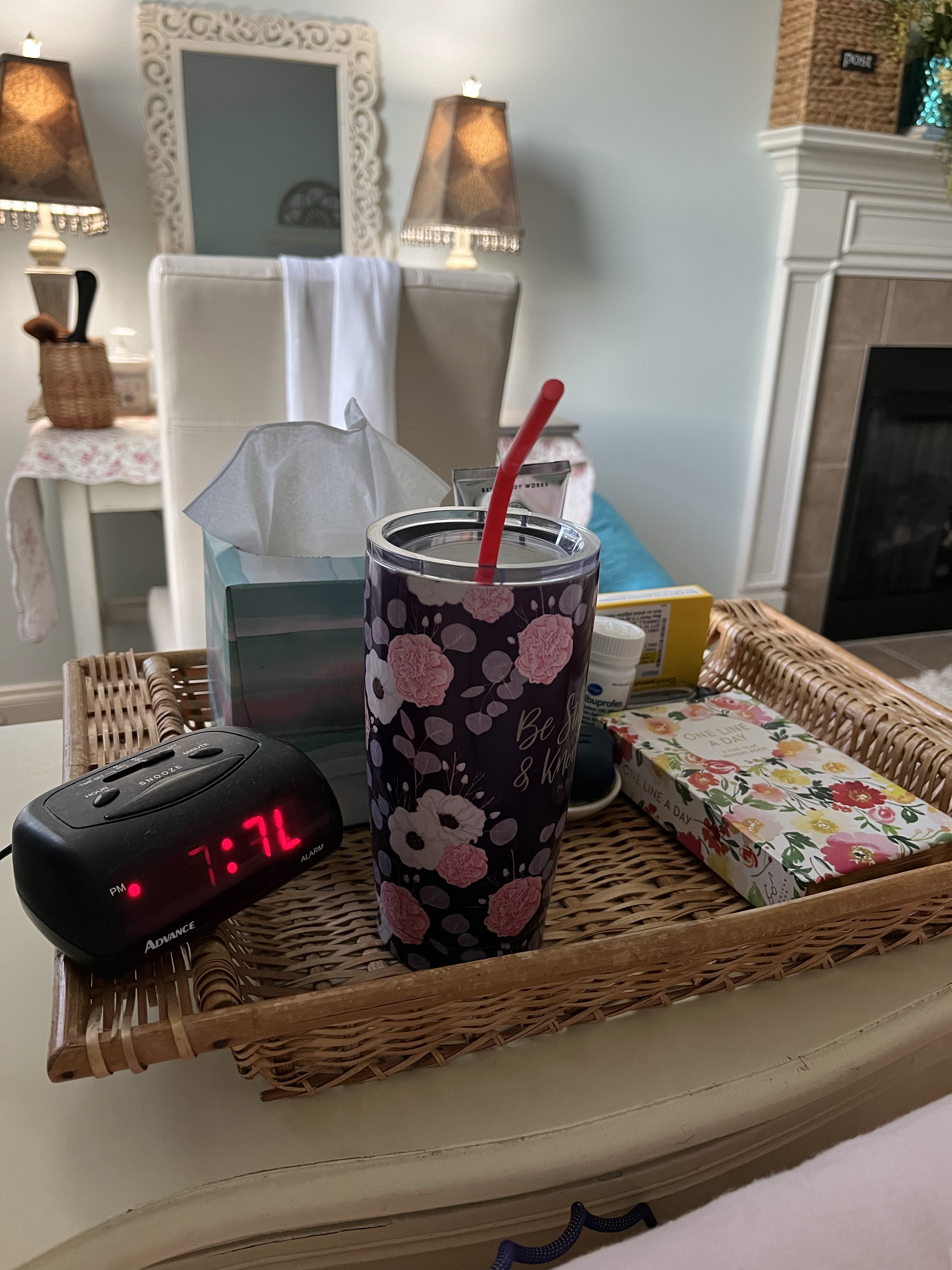 - Put cold beverages into an insulated tumbler. Ginger Ale -(Ale-8 is my favorite!) was what I drank because it soothed my stomach. It was constantly cold in my cup. So refreshing. Be sure to add a straw so it won’t spill.