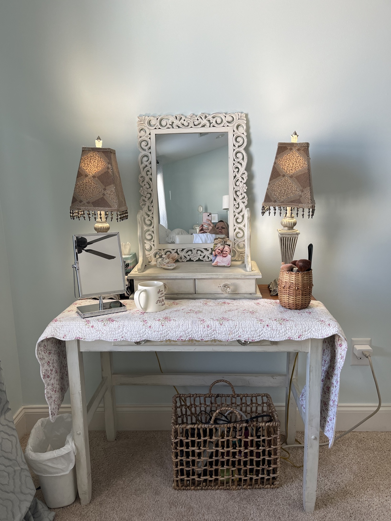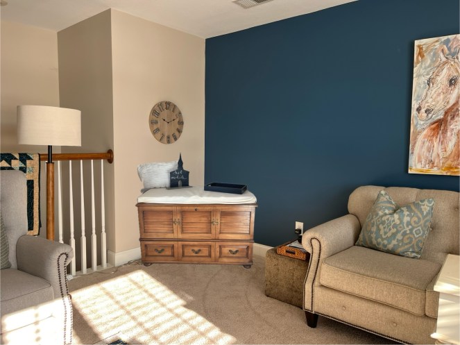 Here’s another picture of where I thought about putting the cedar chest. I was looking for something that could serve as a coffee bar in my family room. I really didnt’ want to purchase something, but use what I already had. Shopping my house brought my attention to the cedar chest in the spare room. So here’s the picture with the sticker of the cedar chest kind of in the right spot. It looks like the cedar chest is actually in the room, doesn’t it? It’s just the sticker of it! But seeing it made me realize that I would like it there BEFORE I had to move it. (It’s heavy!!)