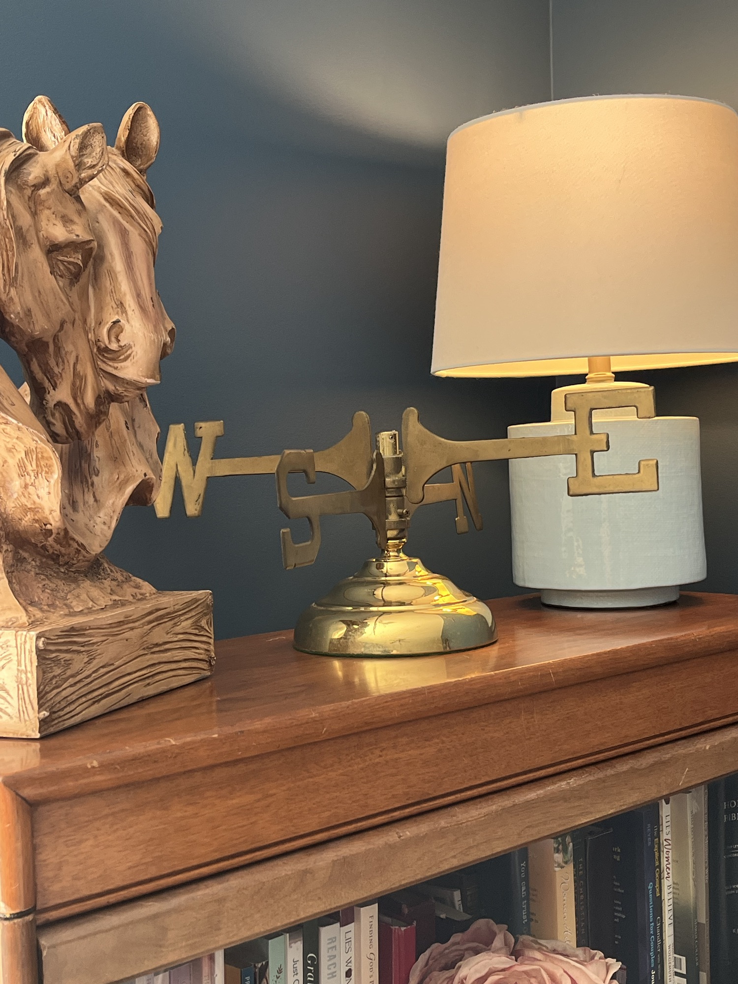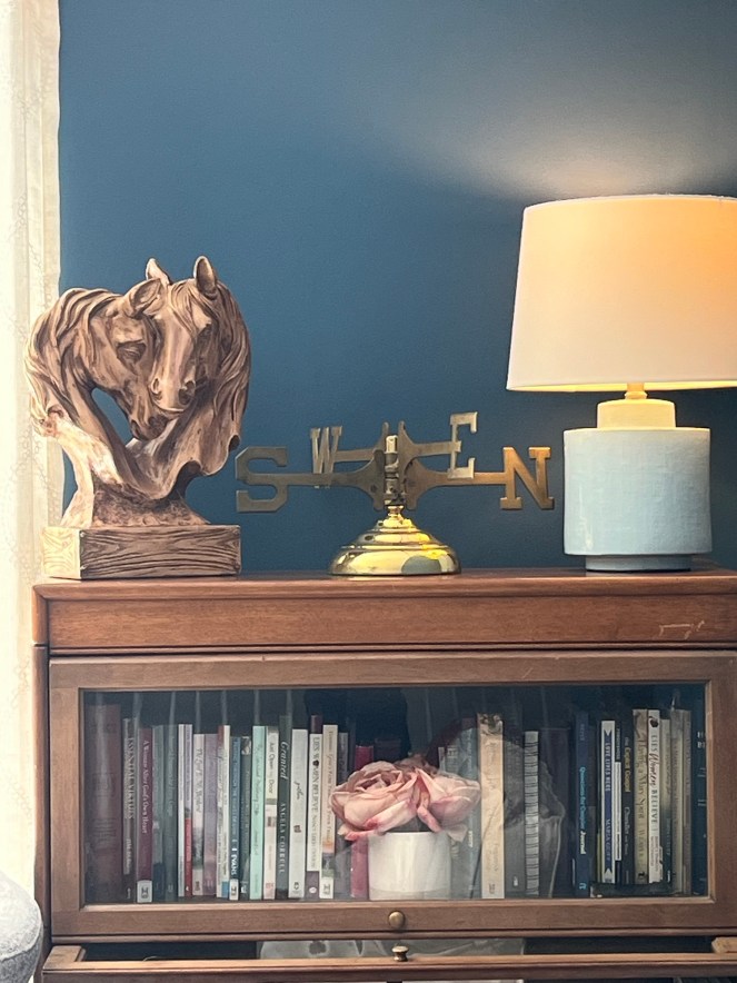 I love the brass accent against the blue wall. It also made me pull out some other brass items I have and put them around the room. I love it! I love that every time I look at the weather vane my mind immediately goes to the goodness of God. I love that it’s unique and helps to tell a story of the lives we live and of the God who is always good, no matter which way the wind is blowing!