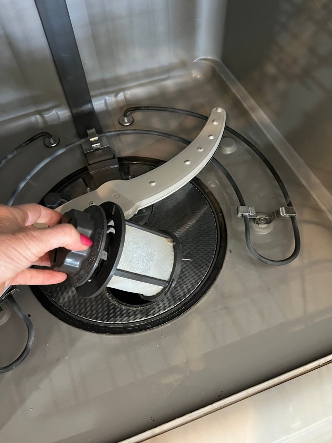 - Lift the filter from the bottom of the dishwasher and rinse it in the sink.