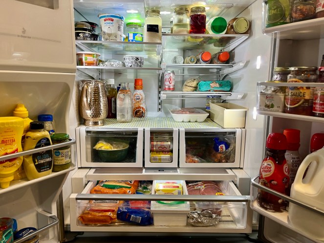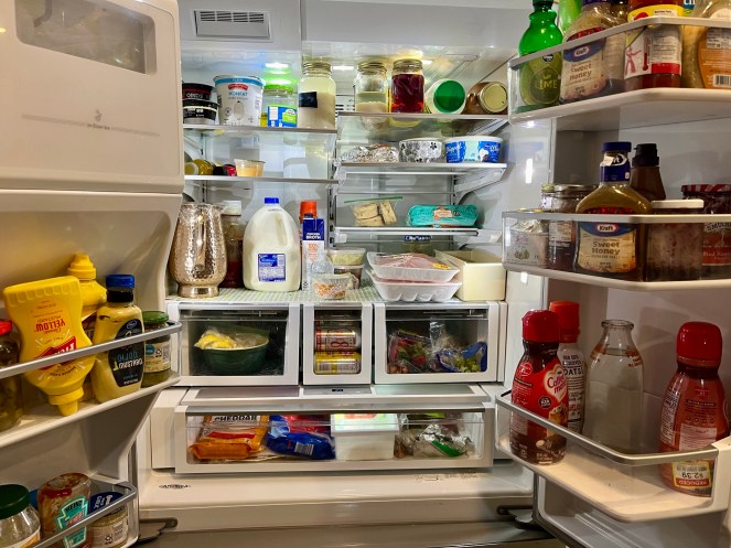 - Remove items, shelf by shelf. Throw away old condiments or leftovers.