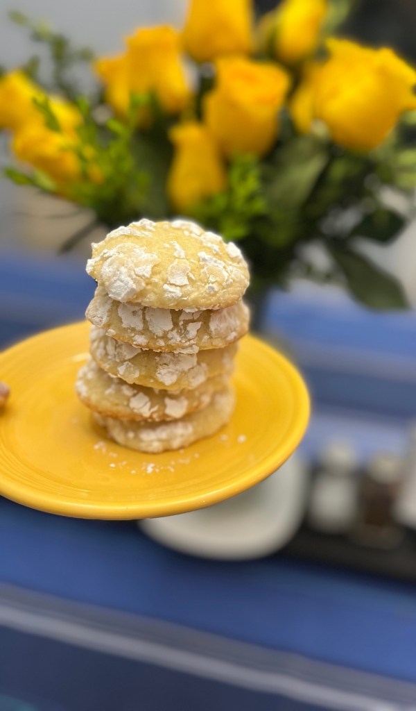 The cookies get rolled in powdered sugar before baking, so the dough “bursts through” the sugar, making them look a bit crinkled. They’re soft and a little chewy, and have a bright lemon flavor. These are perfect for spring and summer! This recipe makes about 2 1/2 dozen cookies.