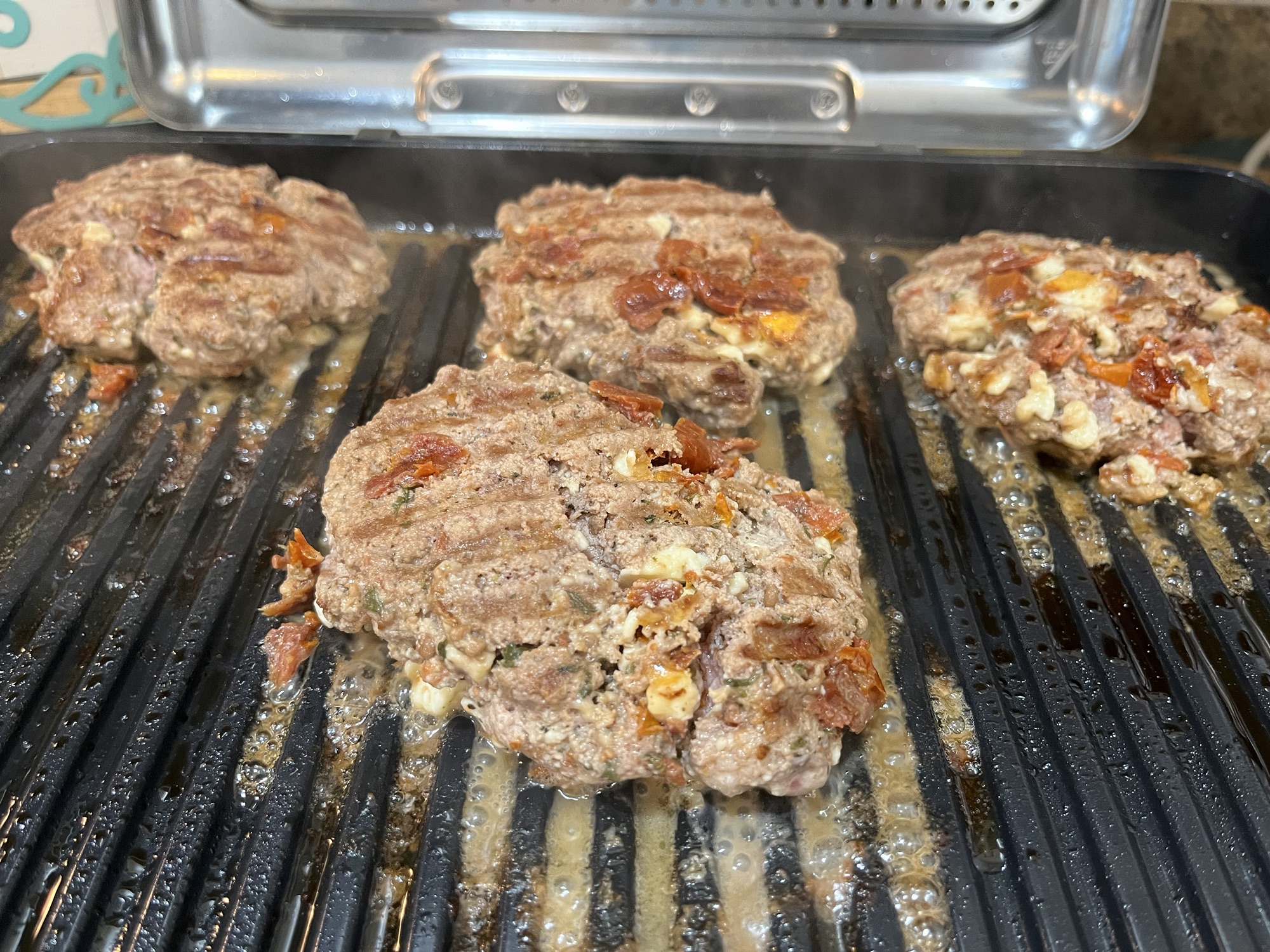 I grilled these on my Ninja grill pan and it seared them up and turned the tomatoes into crispy little bits. The cheese melted down a bit, too, as the burgers cooked. I’m sorry I didn’t get a picture of the burger on the bun; that just may speak for how good it was! This made four burgers. We ate two and I froze the other two for our lunch this week. So, if you follow me on Instagram, I’ll try to post a picture before I devour it!