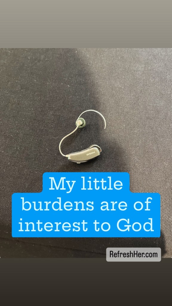 Just then my phone notified me just then that I had a text. The text message said, “Is this yours?” and with it was a picture – a picture of my hearing aid!” I was blown away at God’s care for me and at the timing of this message! This “little burden” wasn’t little to God. He heard my cries when I brought it to Him, and here was His provision for this small matter that was of huge importance to me.