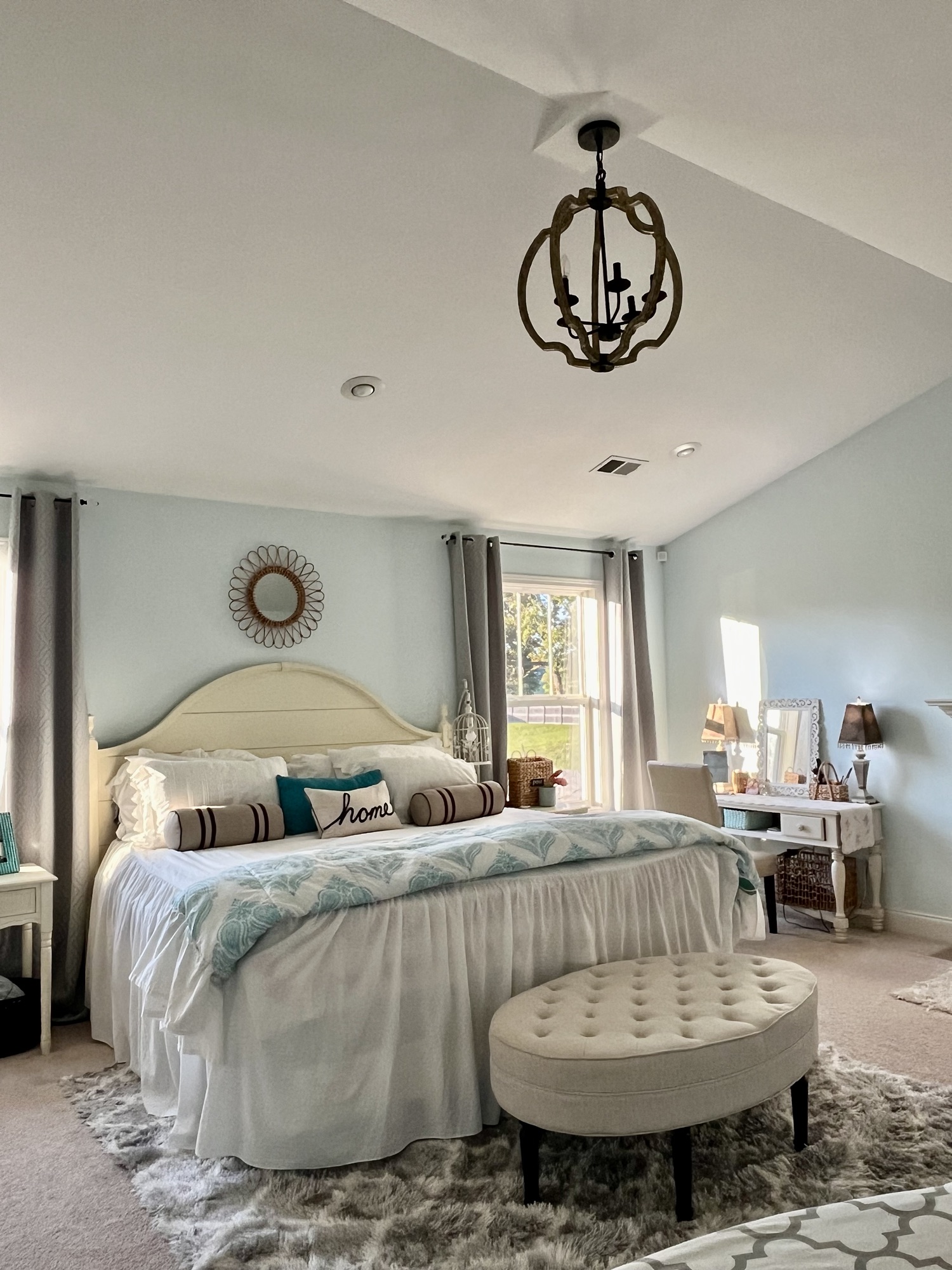 Here’s how the bedroom looks now that the “Spider fan” is gone and the living room light is up!