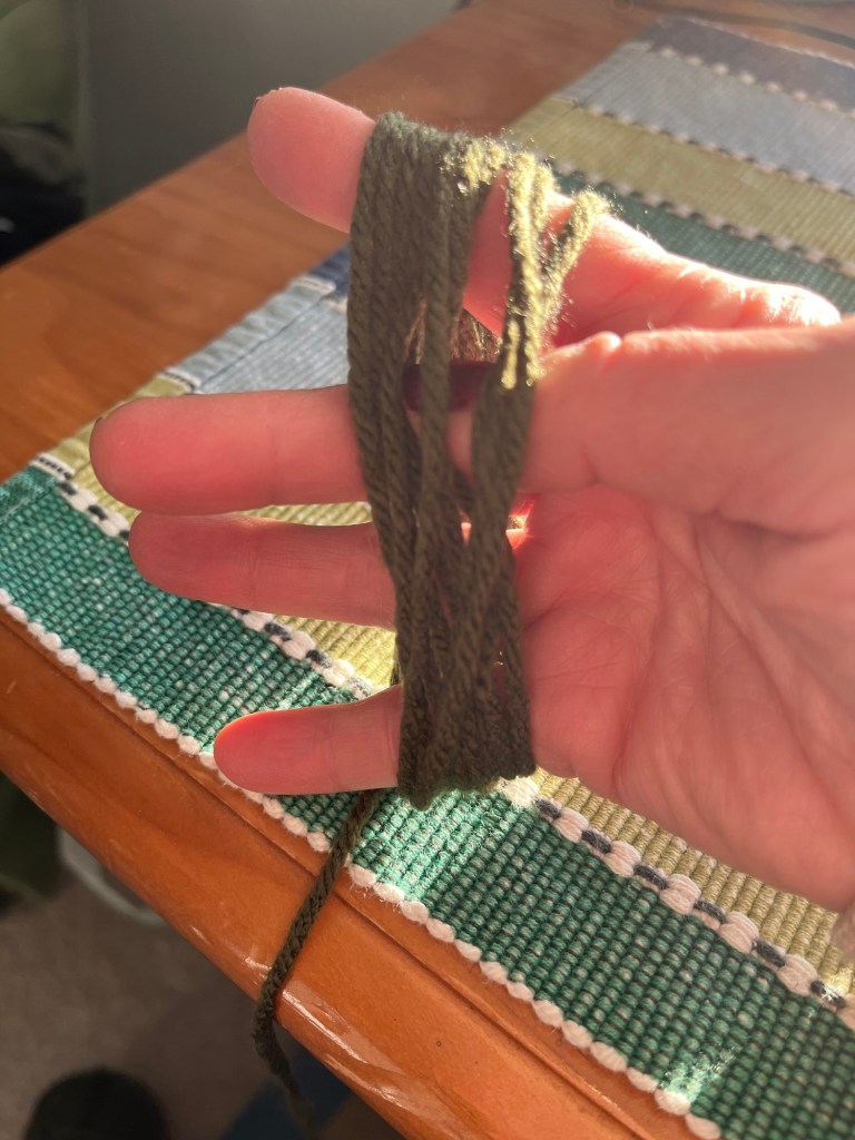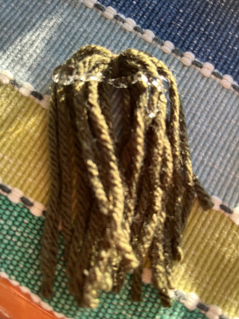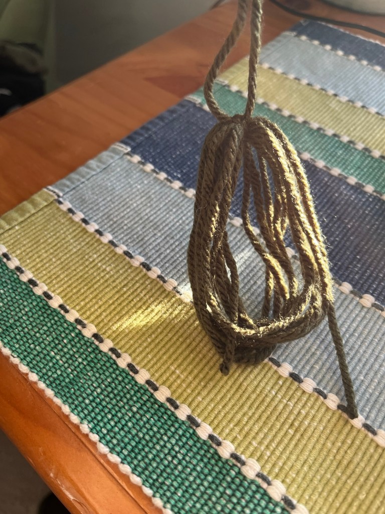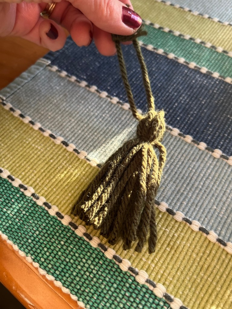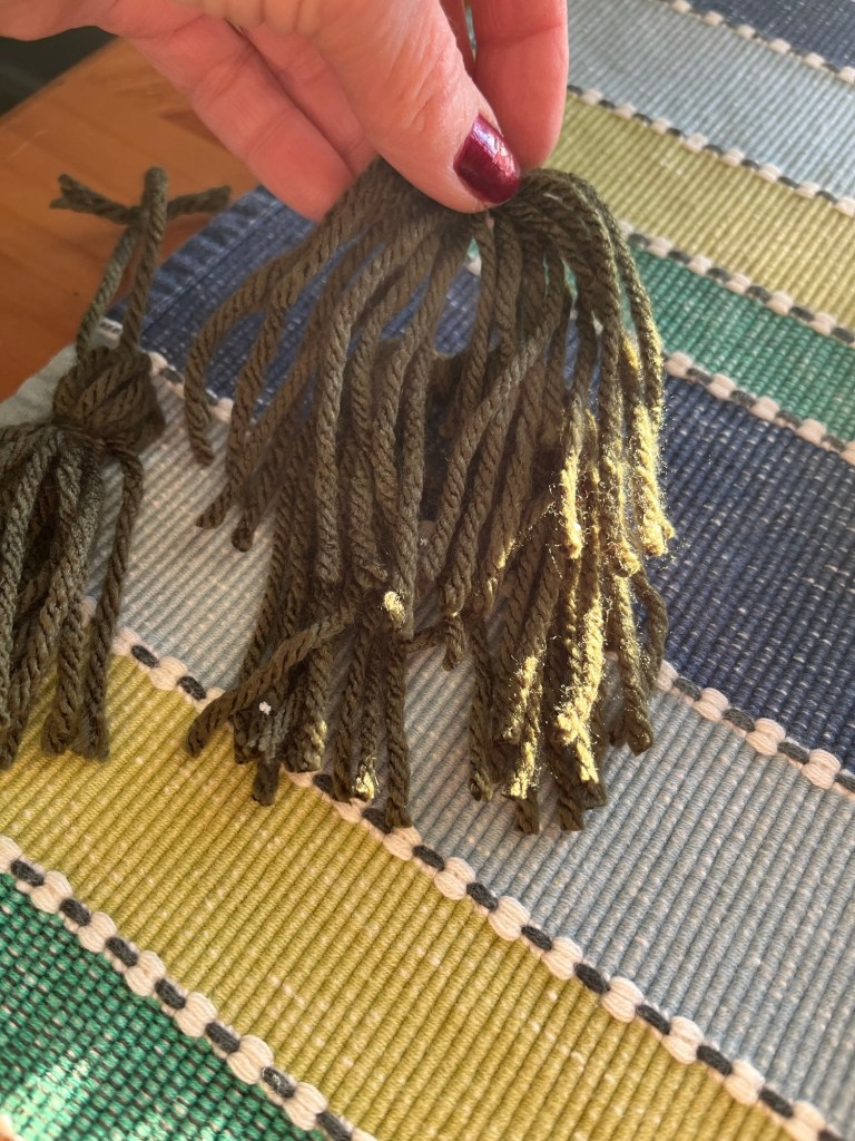 Slip the 8” piece of yarn through the loop and tie in a knot. Take the 8 piece and make a loop for hanging. Tie in a knot. About ½ “ down on the tassel itself, tie another piece of yarn ½” from the top to make the “head” of the tassel. Trim the tassel yarns to 2 ½”.