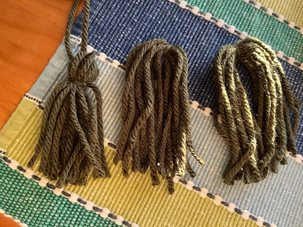 To make two more tassels, wrap the yarn around your fingers, then tie a length of yarn through the loop, but you don’t need a hanging loop, just let it hang down. Trim the yarns to at least 3”. You don’t need to make the neck on these next 2 tassels. You will make two tassels like this.
