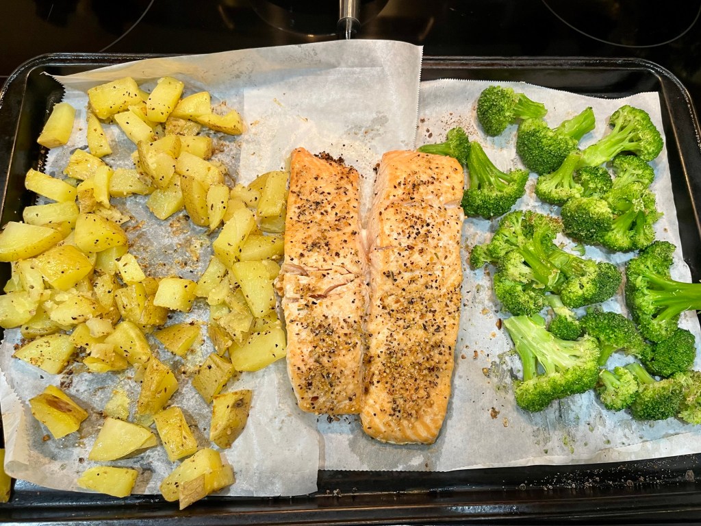 I have shared many sheet pan dinners before, but I have a new one today. This one is Salmon, potatoes and broccoli. This was so good, and was ready in less than 30 minutes!