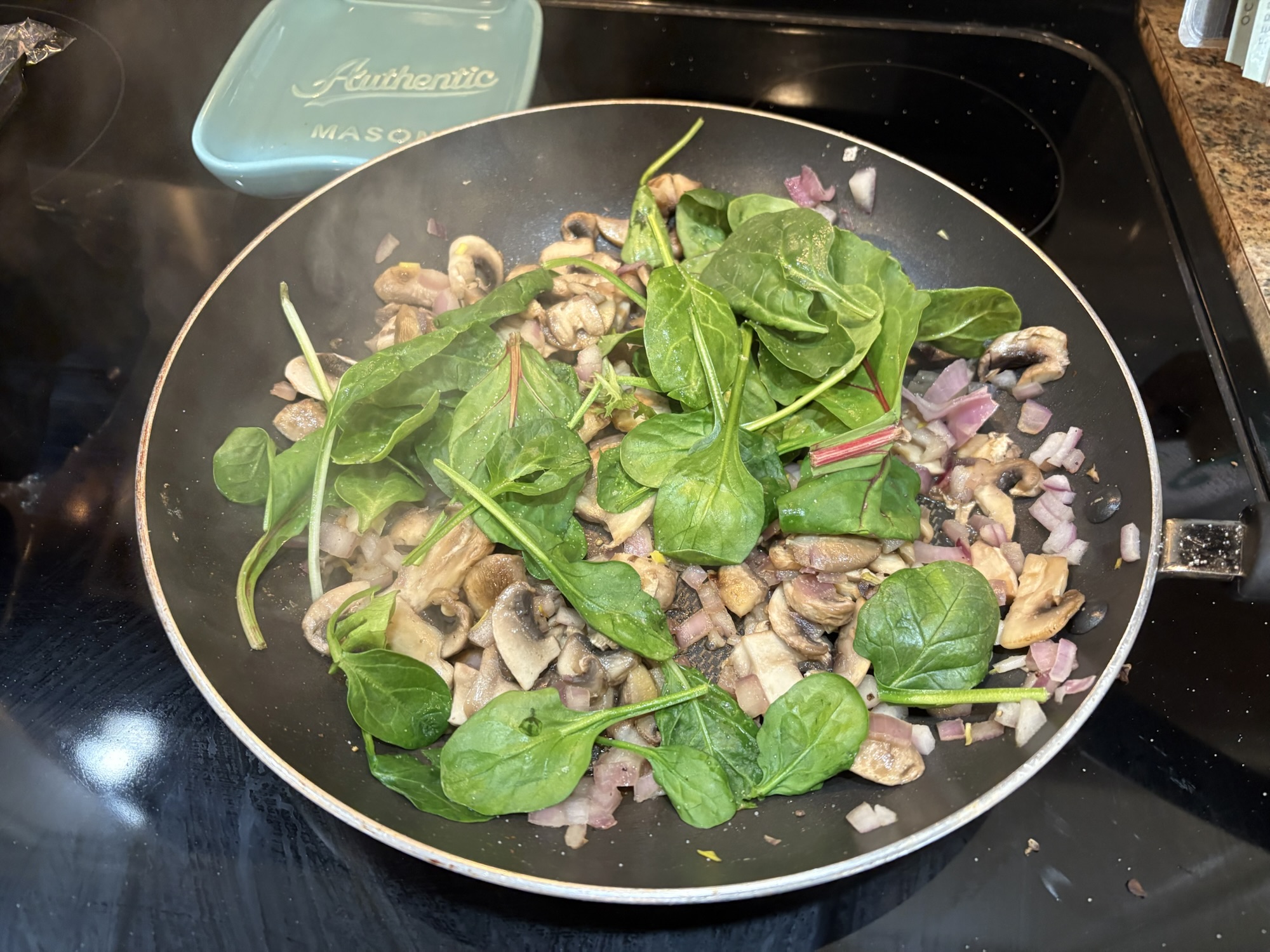 - Heat a large non-stick skillet over medium-low heat and add 2 tablespoons extra virgin olive oil, when hot add the mushrooms and onions, season with 3/4 teaspoon kosher salt and black pepper, to taste and cook, stirring until tender, about 5 minutes.