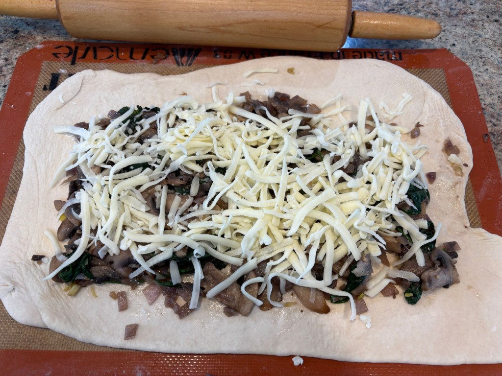 With a rolling pin, roll out the dough on a floured surface to a 16 x 10 inch rectangle. - Place the veggies over the dough leaving about 1 1/2 inch from the edge. Top with cheese.