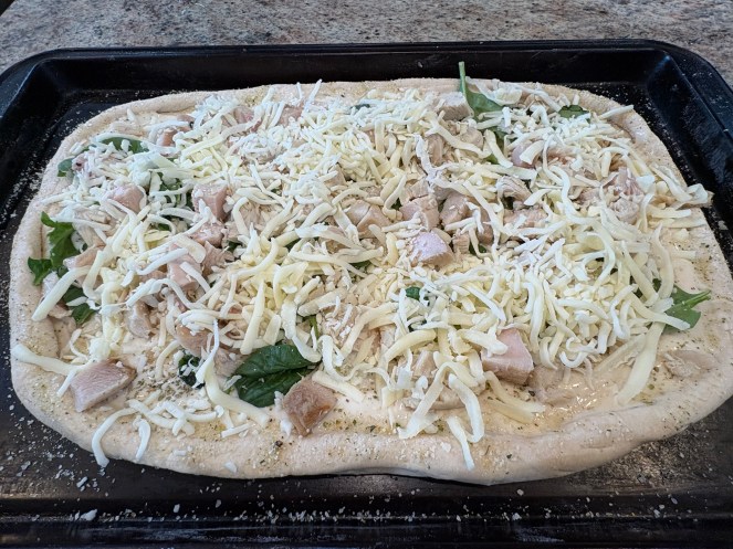 Spread dough over pizza pan or baking sheet. I used a an 11″x17″ baking sheet. The dough will be thin.