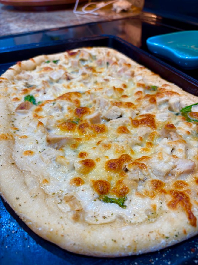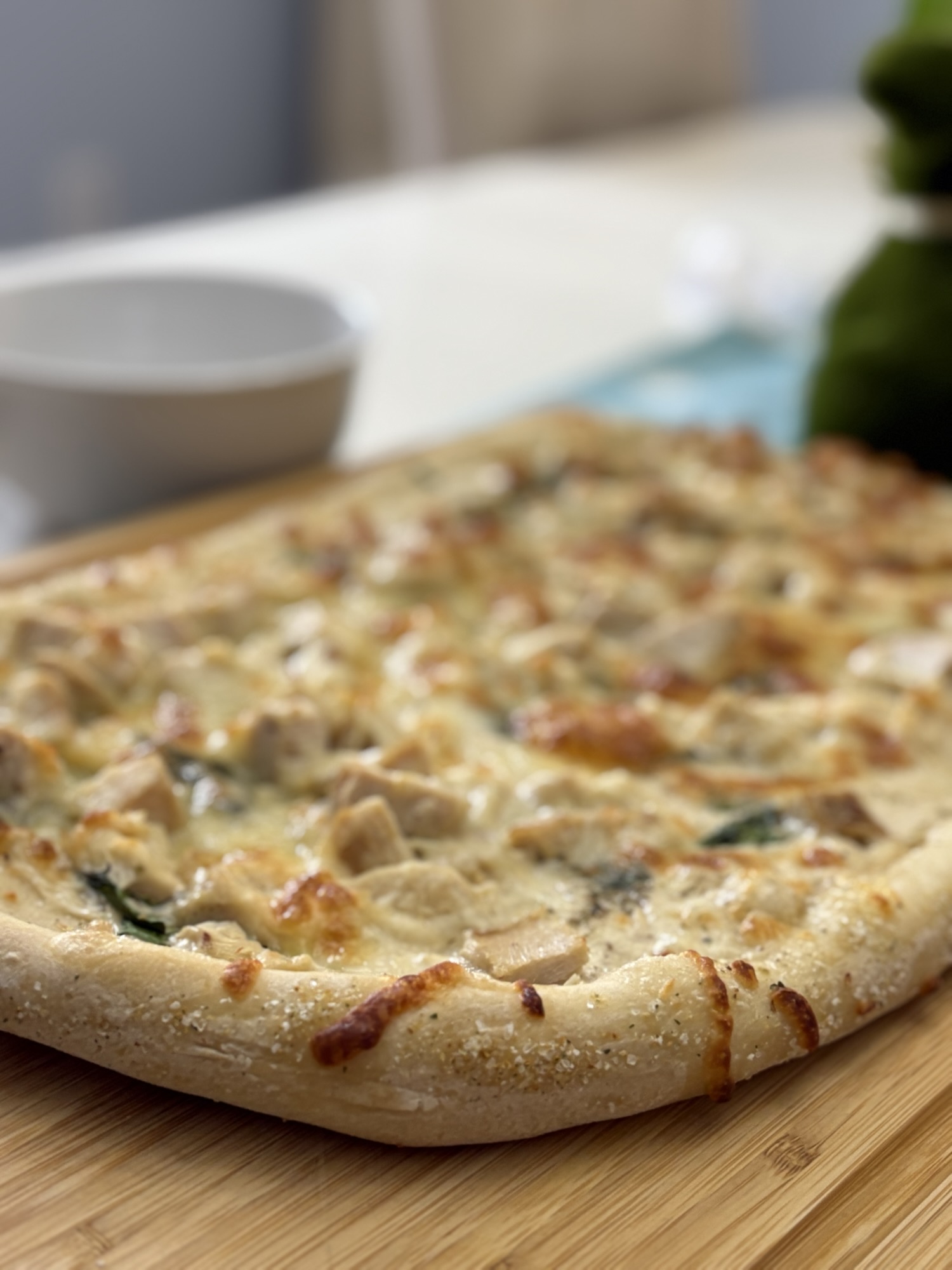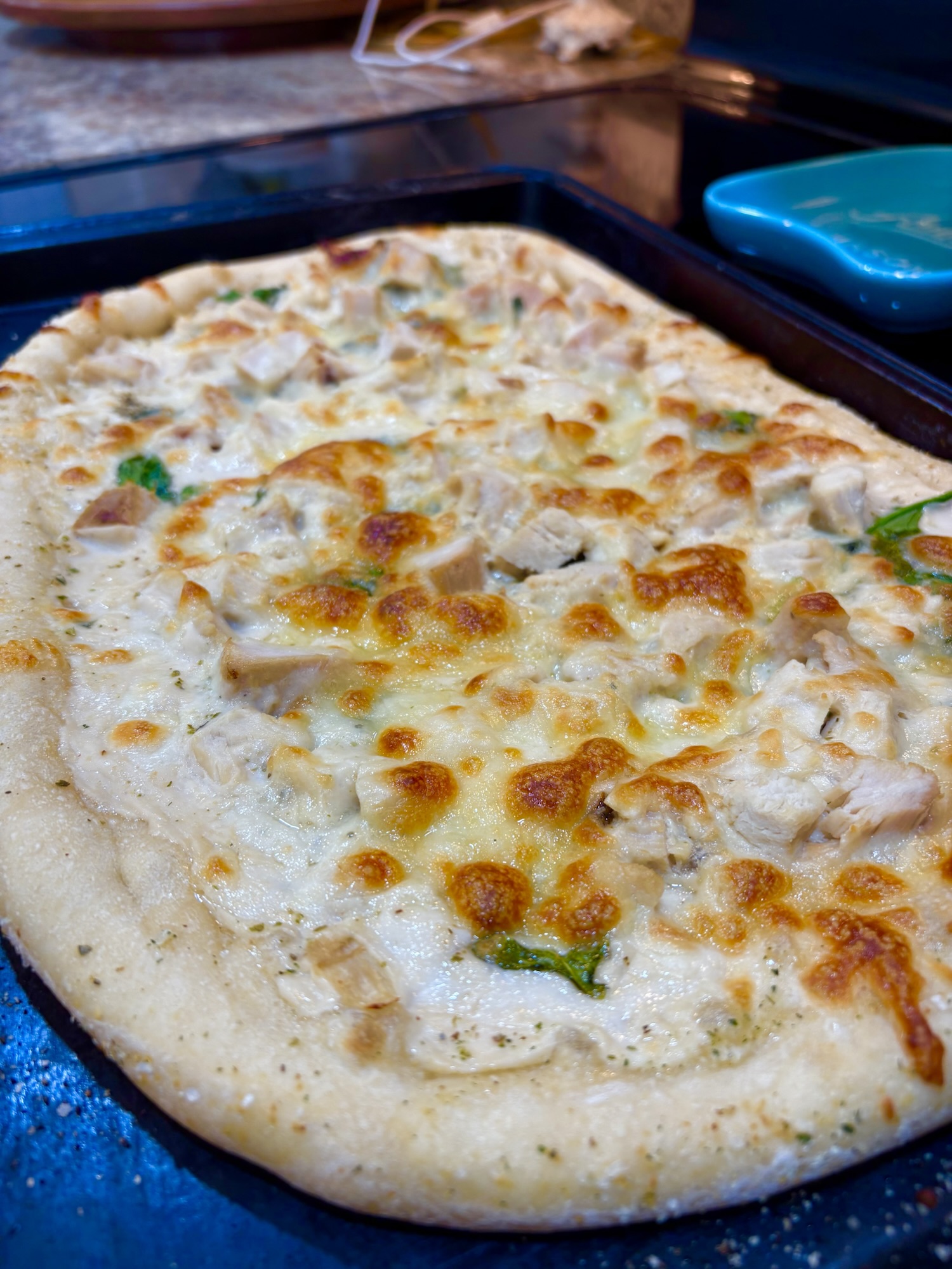 I always keep cooked chicken breasts in the freezer, so when I made this pizza, it came together faster than running out to a pizza place and bringing it back home! The creamy sauce is a really nice change from the typical tomato sauce.