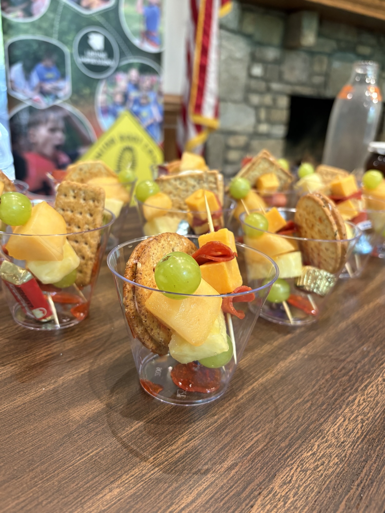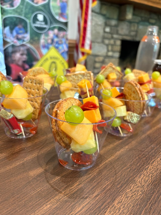 Each of the two weeks we’ve been at camp, I have changed up how I served my Hot Pepper Jelly and cream cheese appetizer. The first week, I simply served it like a charcuterie board, with crackers available. I had the ladies serve themselves. Last week I wanted to ease the serving process, so I made up charcuterie cups. I made up “sandwich crackers” with the cream cheese and jelly, and added skewers of fruit and also meat and cheese. I finished it off with a chocolate in each cup. This made serving so much easier. Each lady could simply pick up and a cup and enjoy!