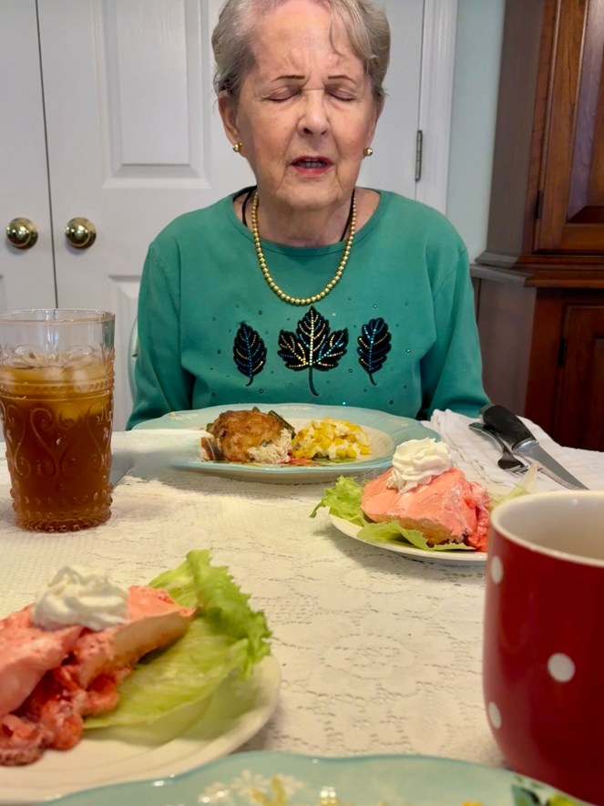Being a guest at my mom’s table is still a joy at this age/stage of my life! It’s a blessing to get to share a meal together, but more than that, time to go to church together, hear God’s Word, talk about spiritual matters, prayer requests, and also listen to David Jeremiah in the evenings. That’s better food that that delicious meal…seriously. I am blessed.