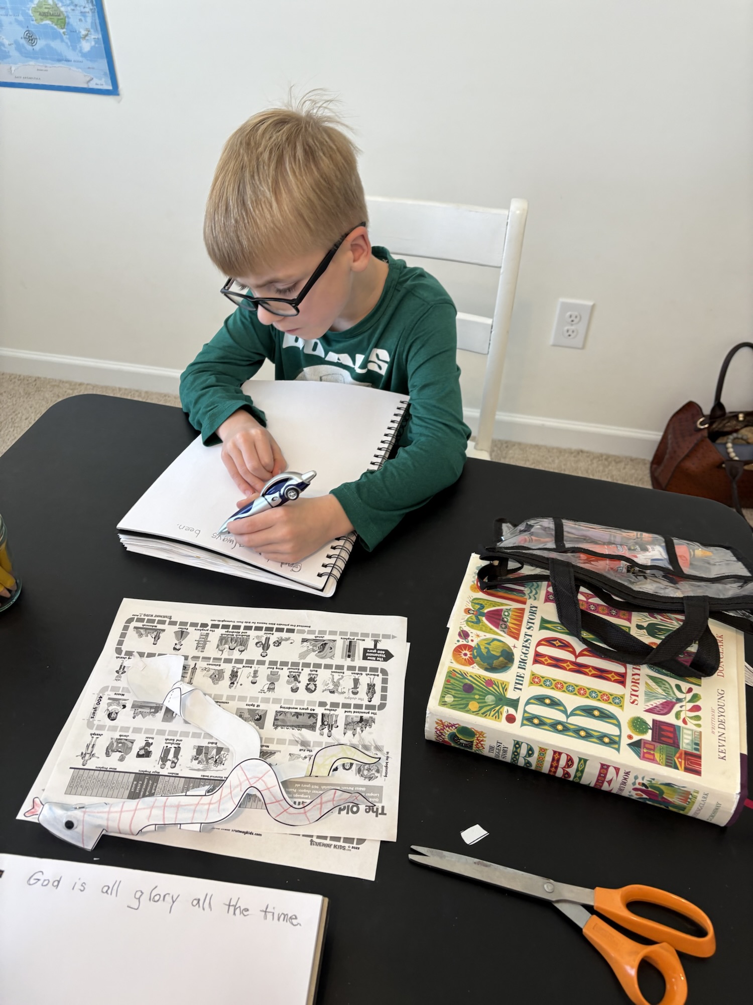 This week I had the blessing of starting Bible Club back up with my grandsons. We used to meet weekly before they were in school, then things were too busy in their schedules to fit it in. However, we have found a day and time that seems to work for everyone and I was thrilled to pack up my bags and head to their house to begin a journey through the Bible with my sweet little guys. There was lots of chatter and plenty of laughter! I just hope that somewhere in between they gained some new understanding of their God, and of Jesus, the Head Crusher (Genesis 3:15)! I’m desiring to help them understand the timeline of the Bible and of the sweet Story of redemption that began in Genesis. They’re familiar with this because of their parent’s diligent instruction, but I pray I can reinforce these truths even more in their hearts. What a sweet privilege!