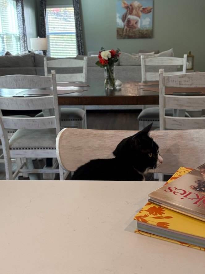 I’ll end with a kitty picture. Socks belongs to my grandsons and is the sweetest. Of course, she also “joined in” while we were having Bible club! I love that cats want to be a part of whatever is happening. I snapped this as I was getting ready to leave their house. It sure makes me miss my sweet Liza.