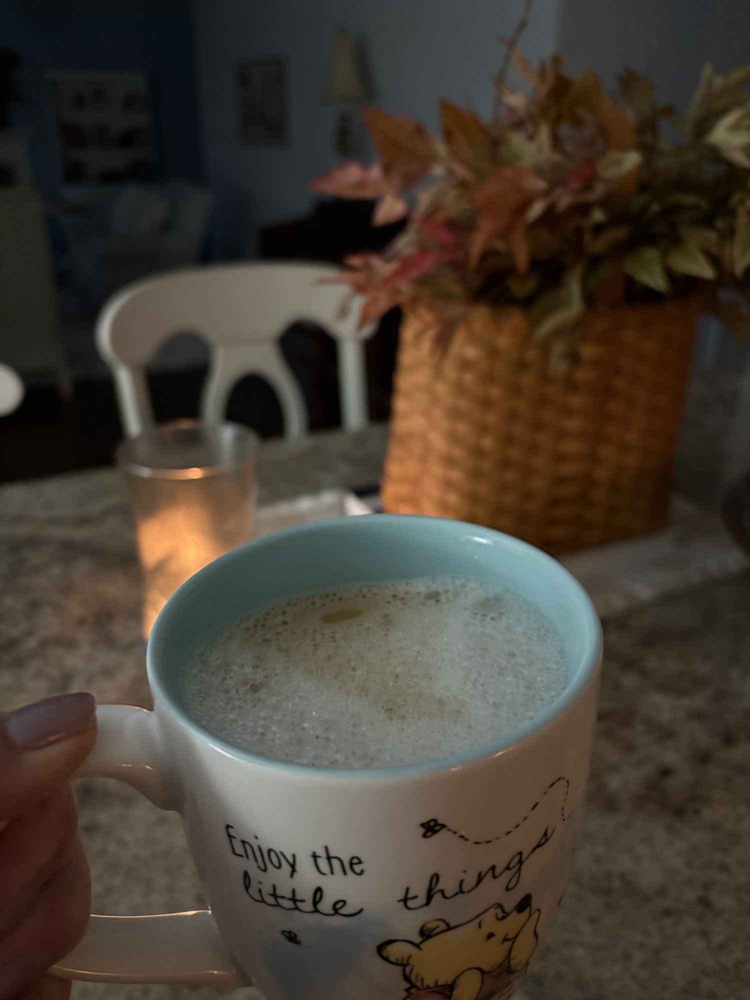 I lit candles both upstairs and downstairs. Their flickering light help keep the house cozy and not so dark, and the fragrance was heavenly. Apple Cider from Yankee Candle is a favorite fall scent. Coffee is a given every morning, but it was not just wanted – it was needed!