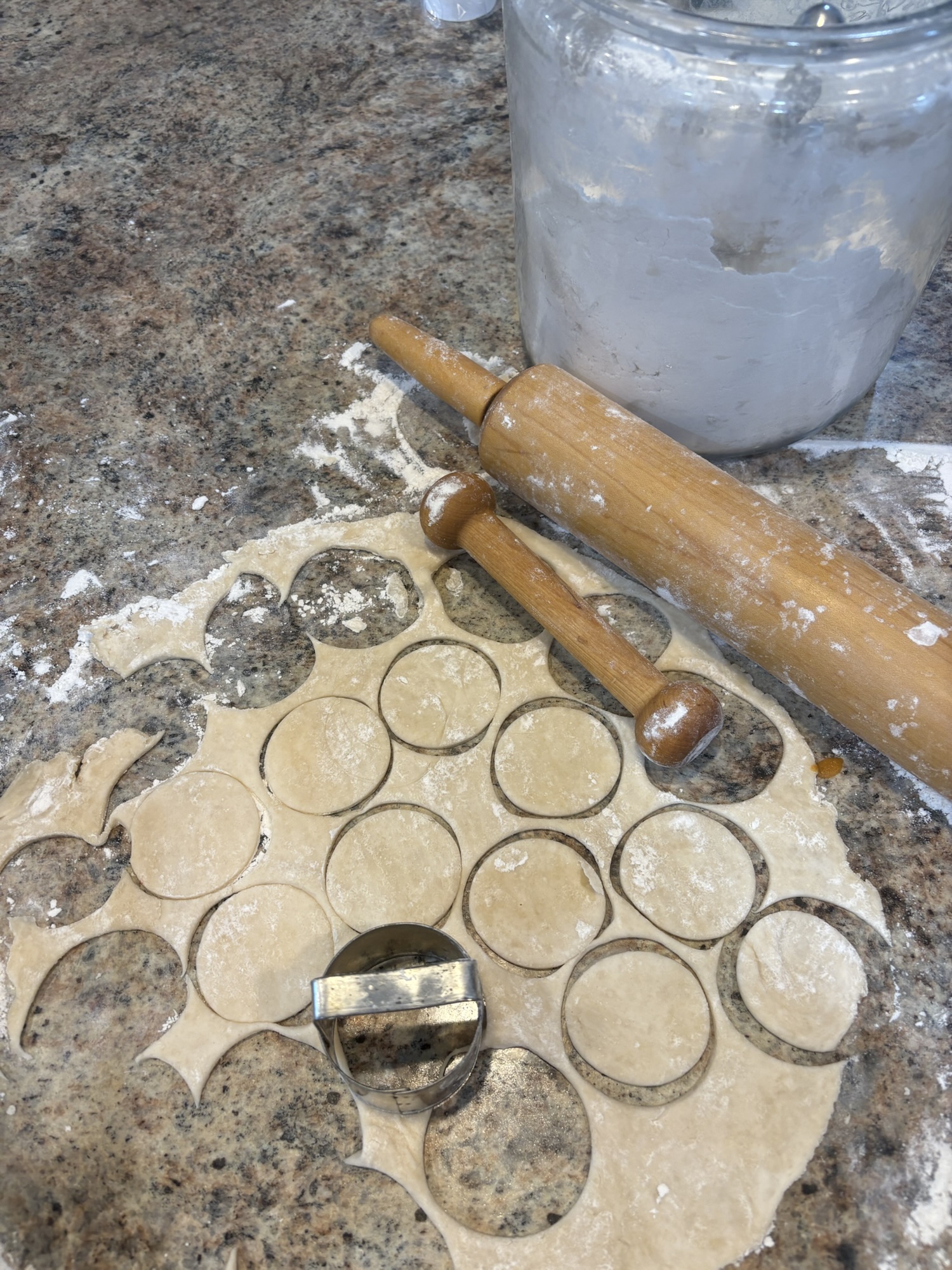 To make the mini pies, I simply used a small biscuit cutter (you could also use a small glass) and cut rounds a little bigger than the bottom width of the mini muffin tin so the crust will come up the sides of the pan.