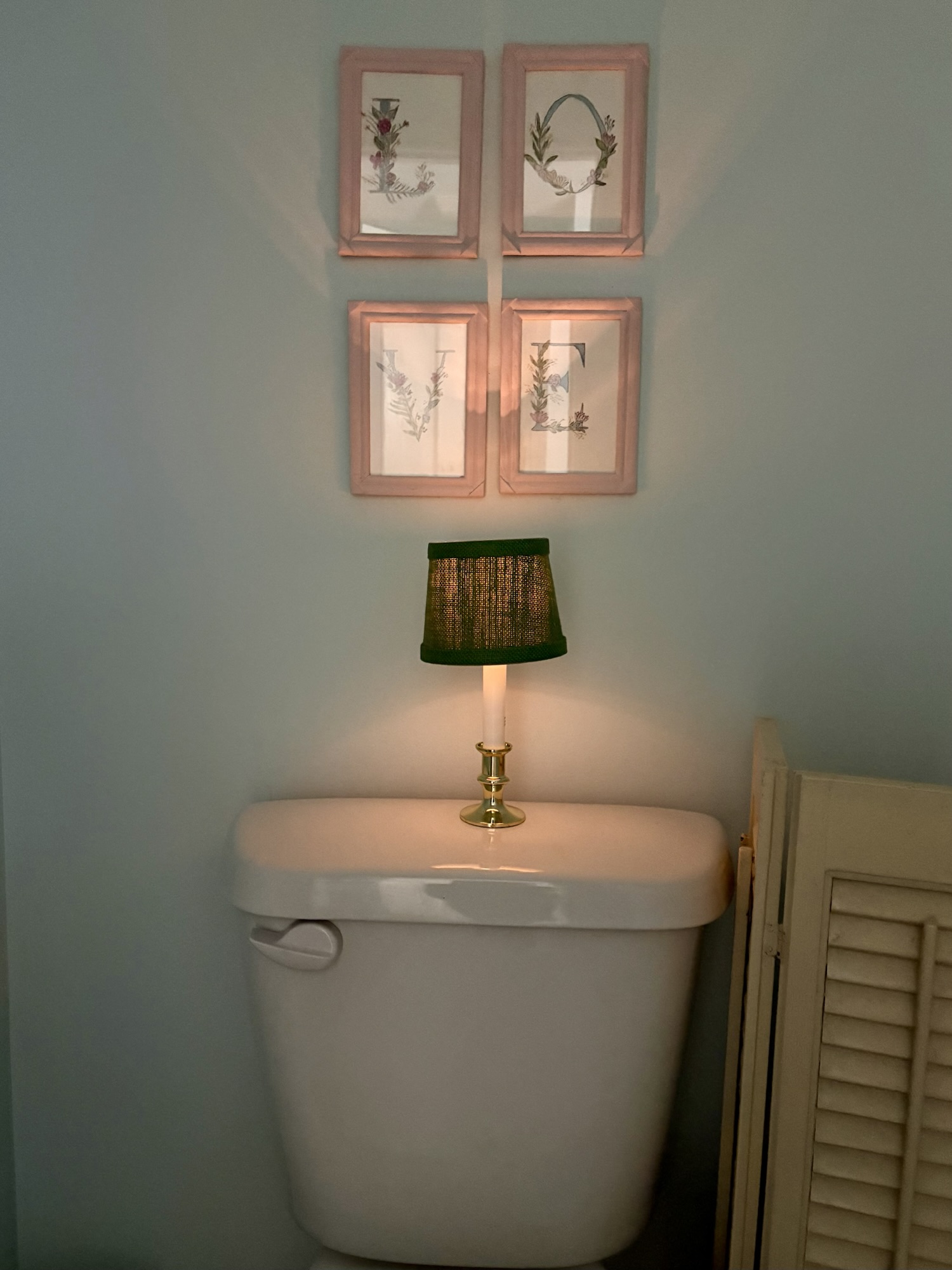 Our master bathroom has a lavatory that has no outlet in it. It’s just a dark little room with an overhead light. At nighttime when you drag yourself out of bed to make a necessary trip to the restroom, a little light is needed, but with no place to plug in a small lamp, what can you do? One day this past year it dawned on me that I had the battery-operated candles that go in the window at Christmas and come on automatically and stay on for a certain number of hours. I went and pulled one from the Christmas decor box, then put a little lampshade on the top of it. Instant, lovely light and decor!