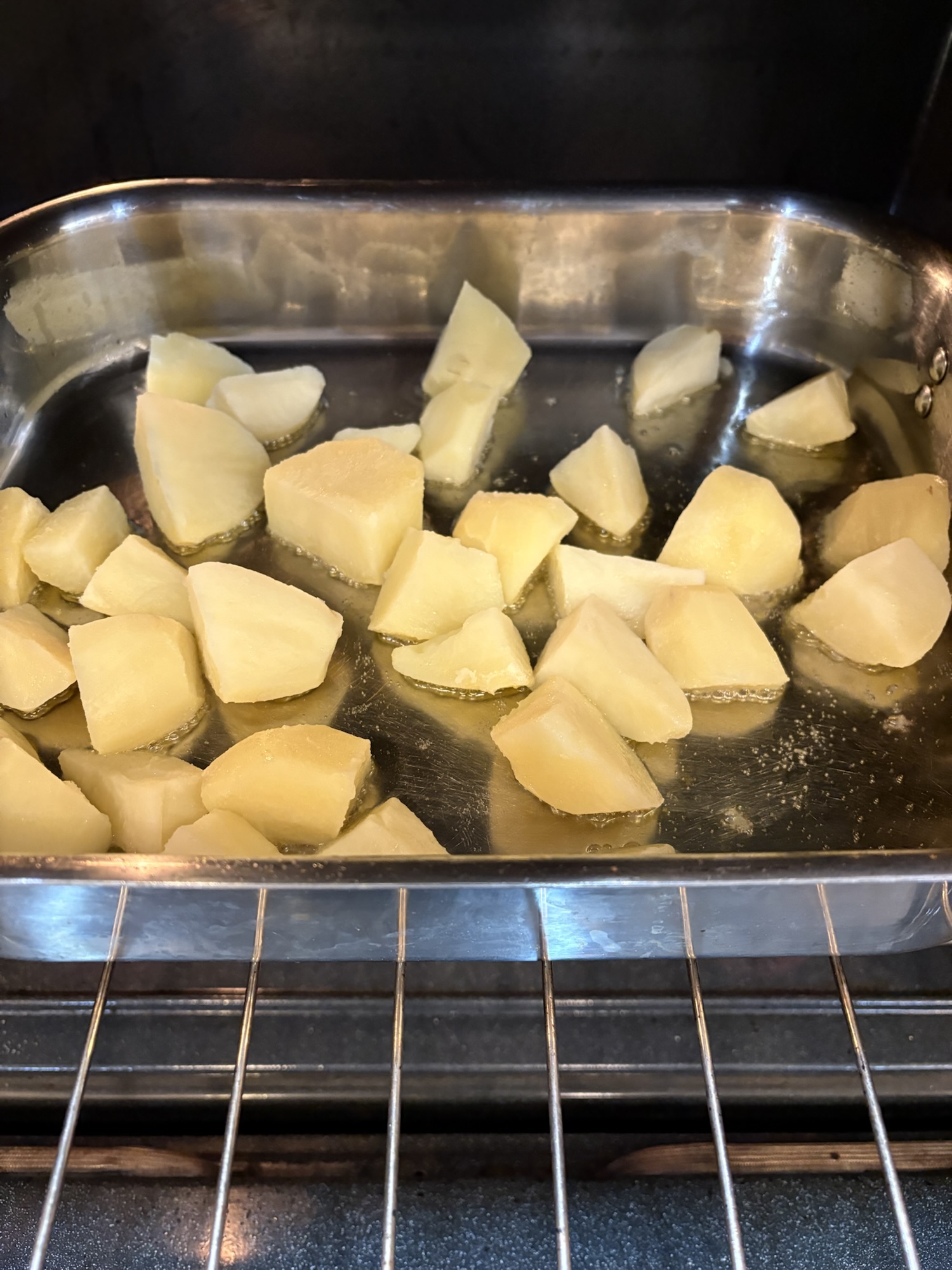 - Peel and chop the potatoes. I think next time I’ll cut my potatoes in half, rather than smaller pieces. It will make turning them in the oven much easier.