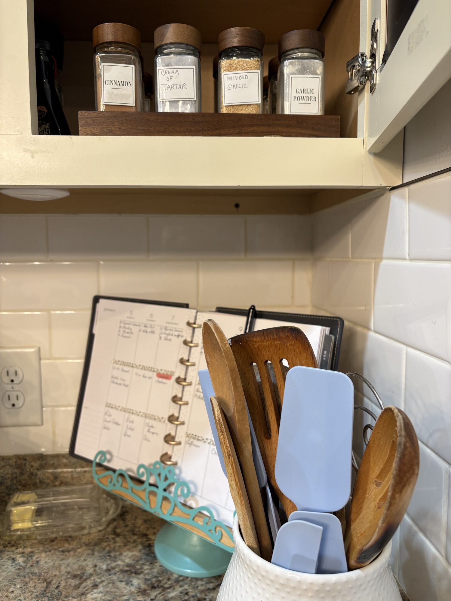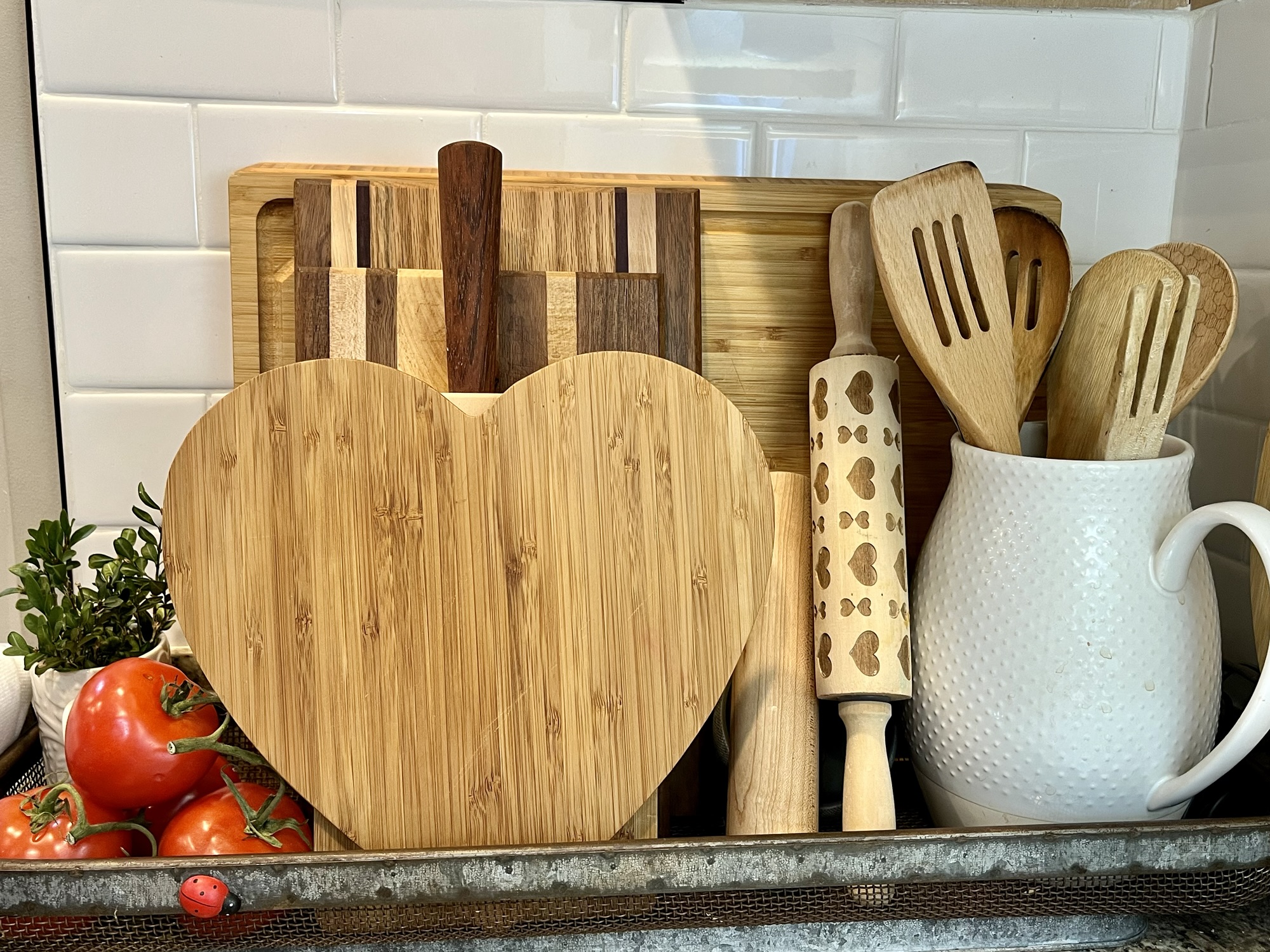 The right size bowls, pretty wooden spoons, a beautiful dish, wooden cutting boards, sharp knives, lovely linen towels, shiny canisters and herbs at my fingertips is what I’m talking about. When I go to cook or bake, it’s so much more enjoyable if I use my favorite bowl made in England that I found at a thrift store, or my cute little wooden spoon that reminds me of the spoon Goldilocks uses in The Three Little Bears.